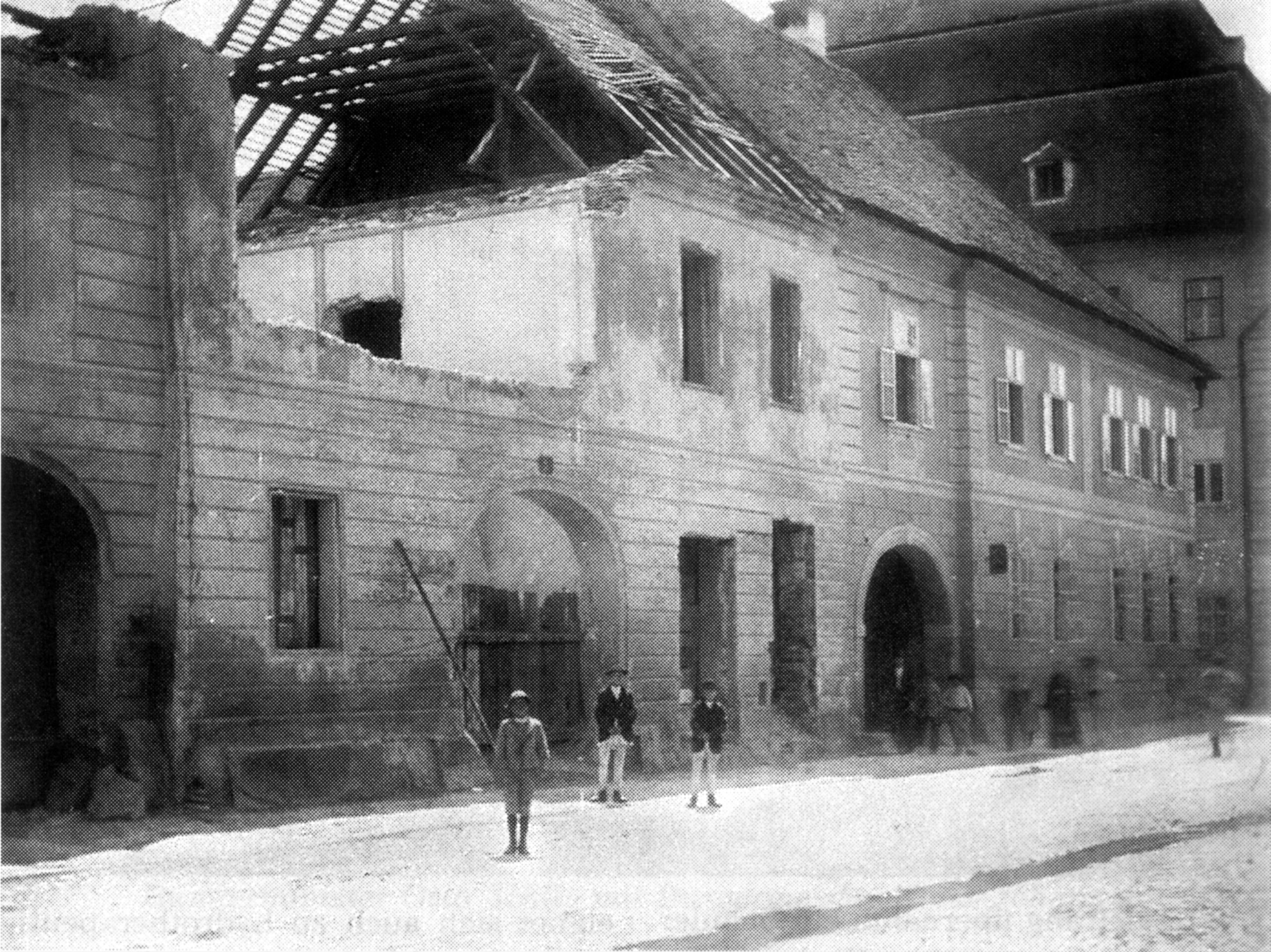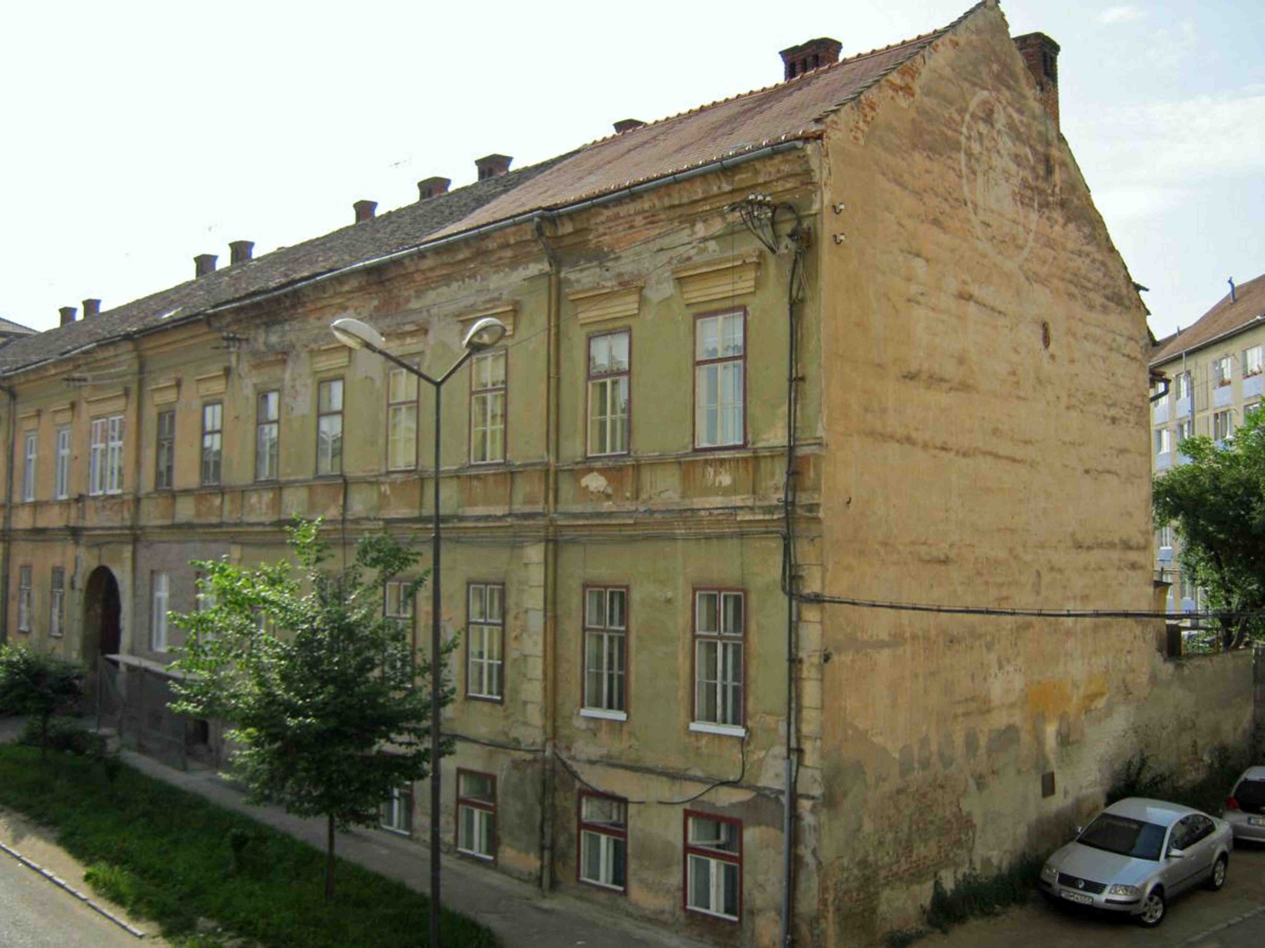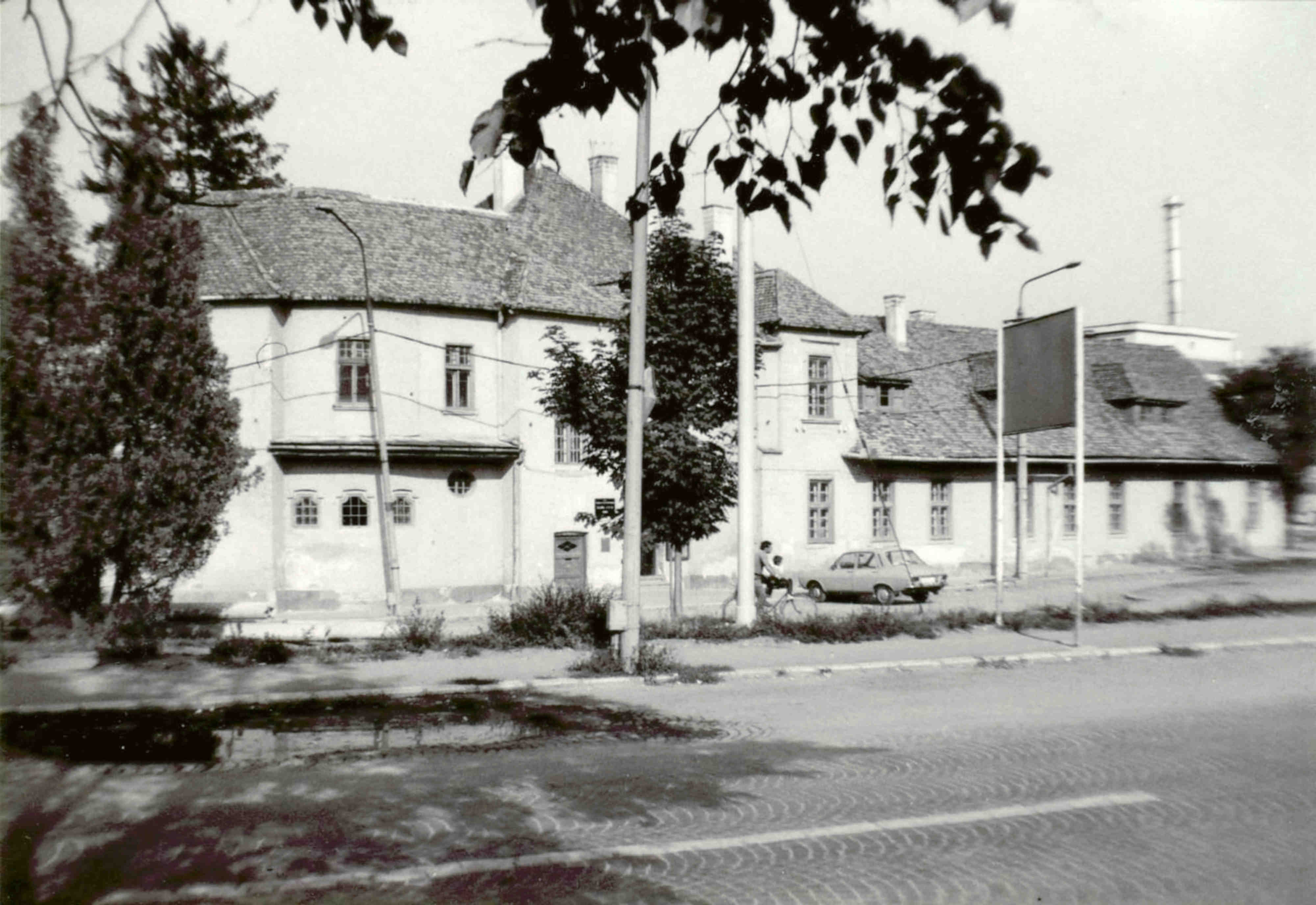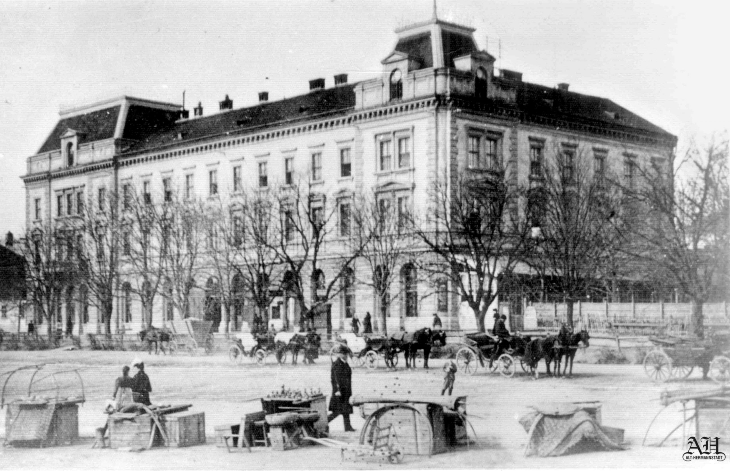 Aceste două fotografii istorice au fost realizate în 1897, cu ocazia demolării a patru clădiri, dintr-e care trei erau situate pe strada General Magheru // Sporergasse ( numere vechi 6, 8, 10 ) și una pe str. George Lazăr // Reissenfelsgasse ( nr.1 ). Pe cele patru parcele libere s-a construit între 1897 și 1899 noul Gimnaziu maghiar de stat conform planurilor arhitectului maghiar Ignác Alpár. De la introducerea limbii române de predare în anul școlar 1919/20 gimnaziul poartă denumirea „Liceul Gheorghe Lazăr”.