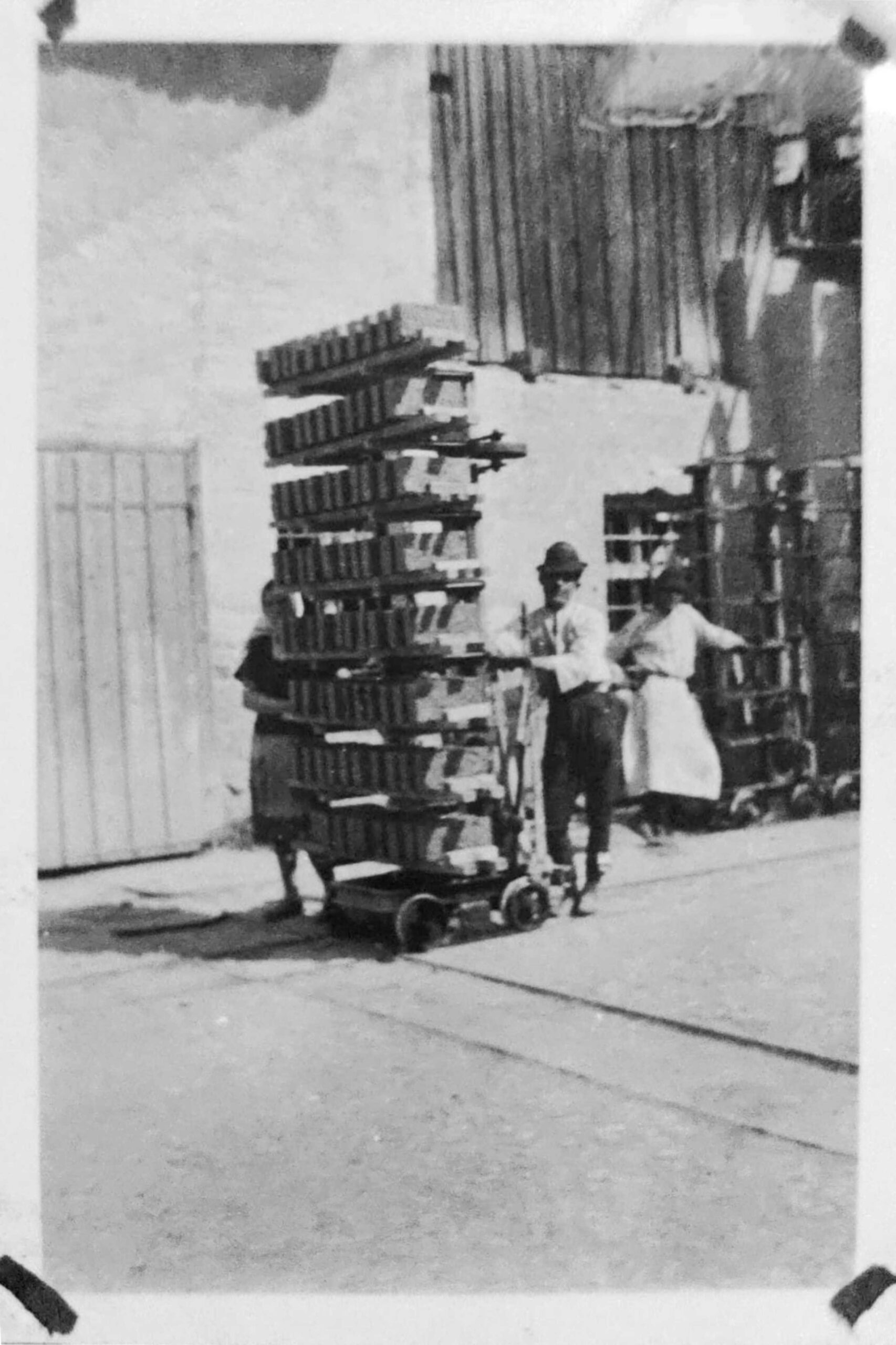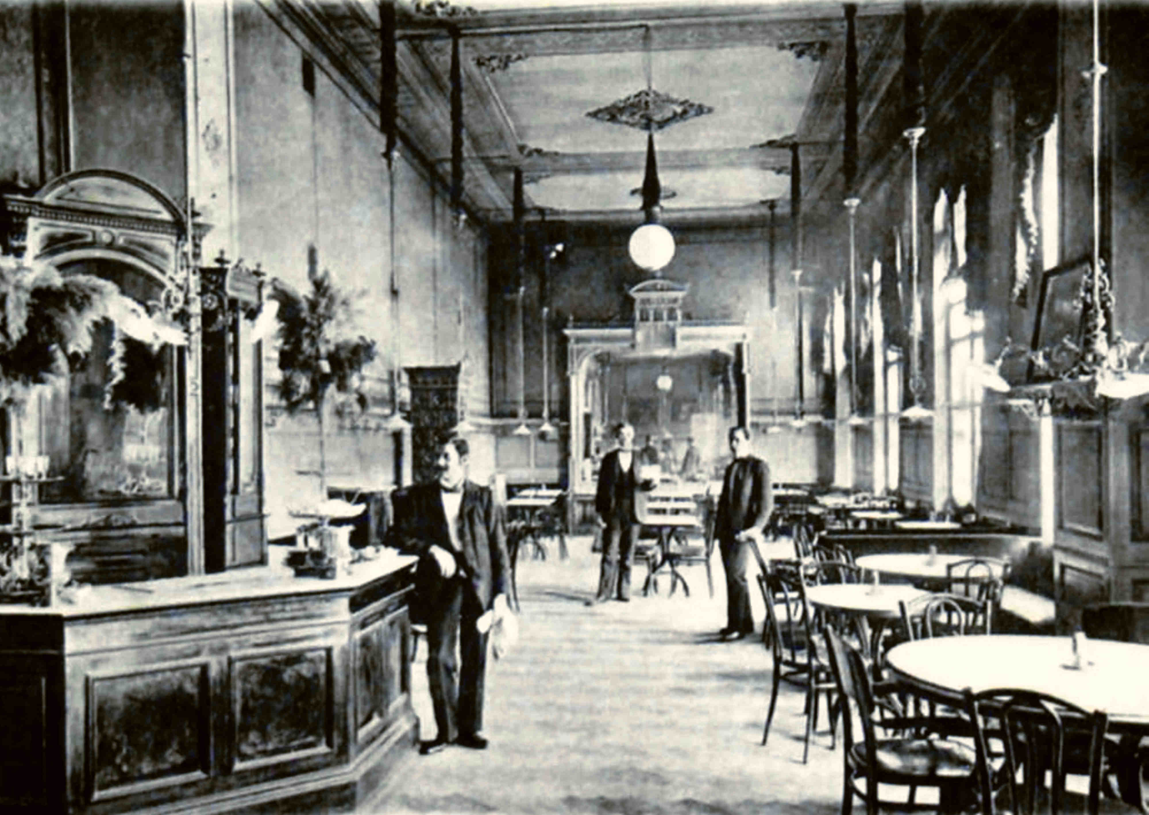 Dreapta: Detaliu alb-negru cu ușa de intrare în magazinul lui Victor Onițiu din fotografia realizată de Emil Fischer în primul deceniu al secolului al XX-lea (aproximativ 1905). Nu este exclus ca domnul cu pălărie să fi fost, însuși, Victor Onițiu.Vă oferim aici textul reclamei comerciale din 1908, urmat de traducerea în limba română: