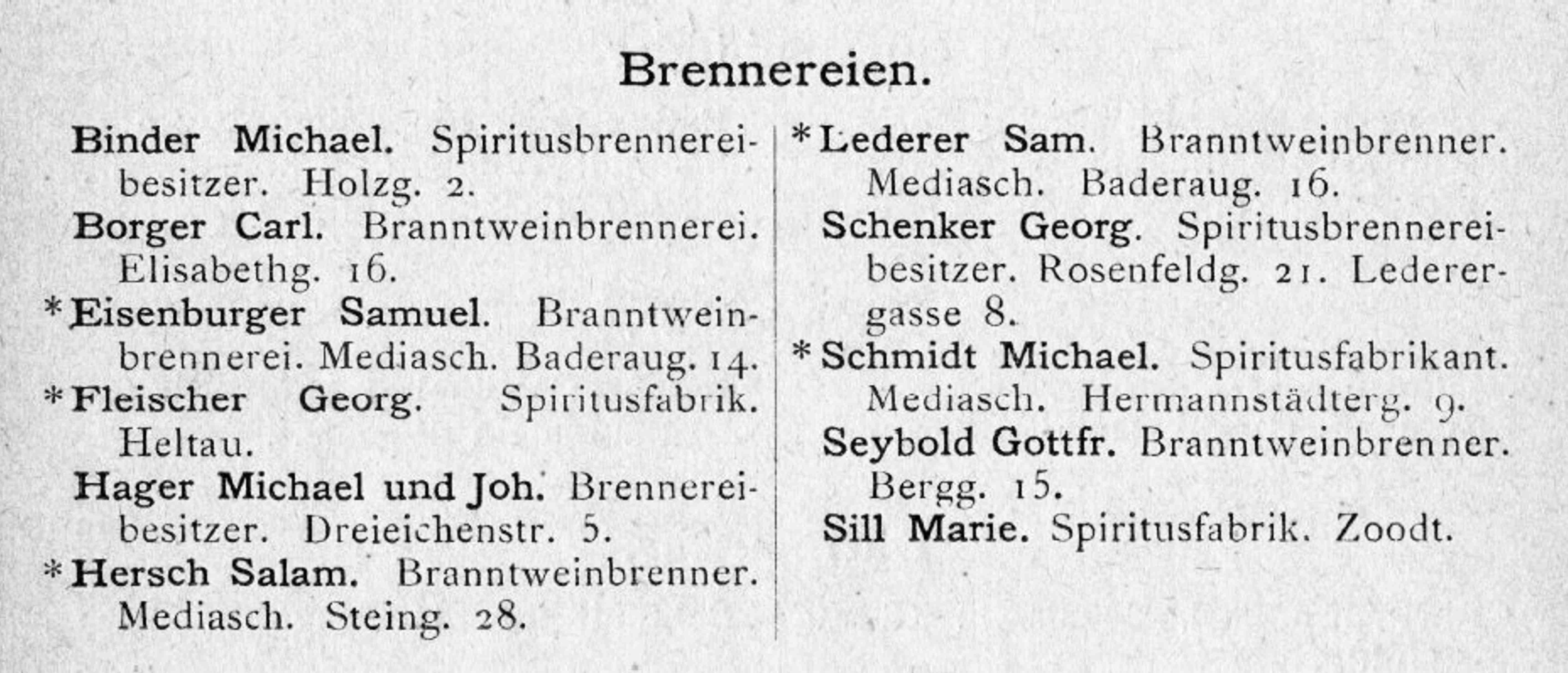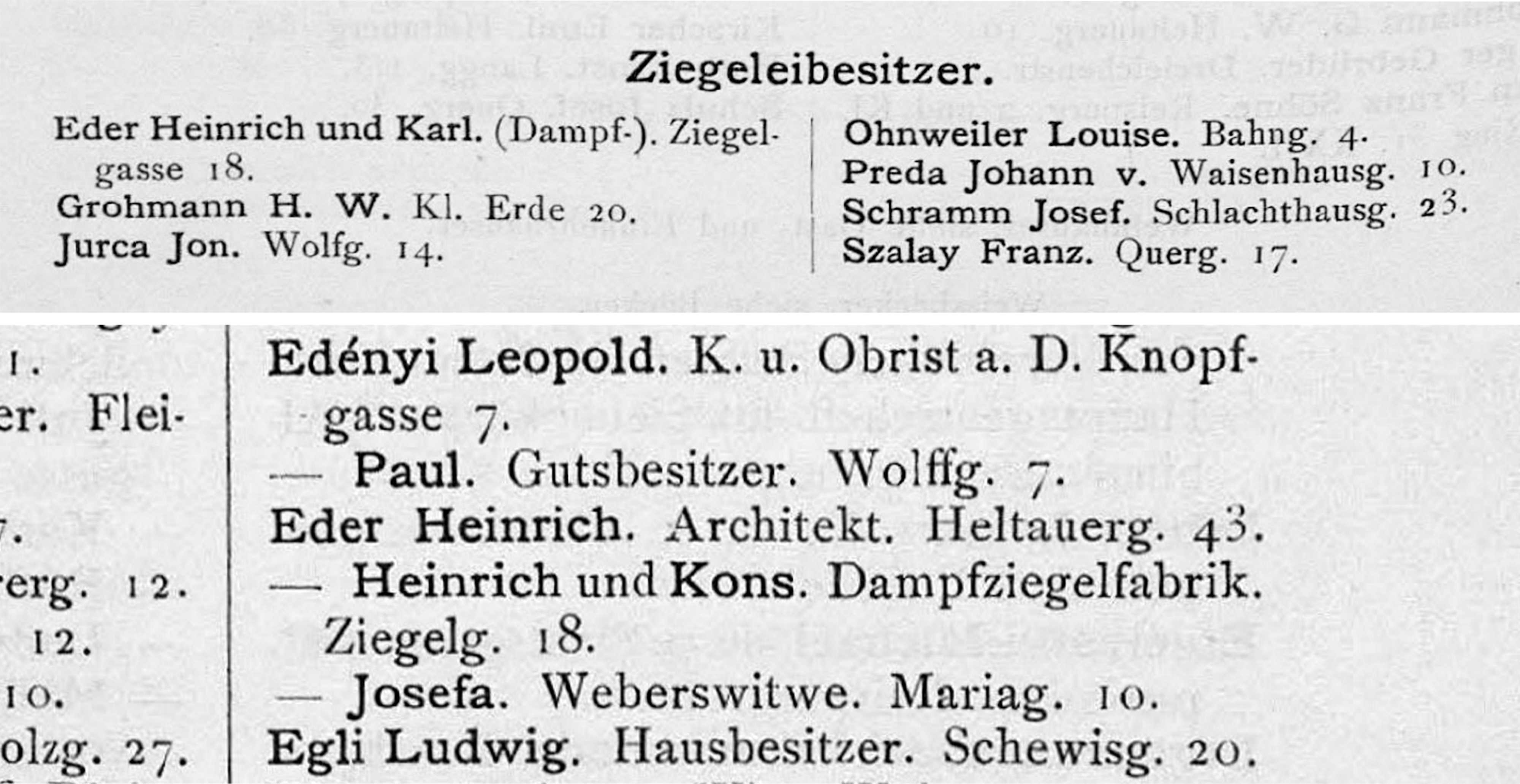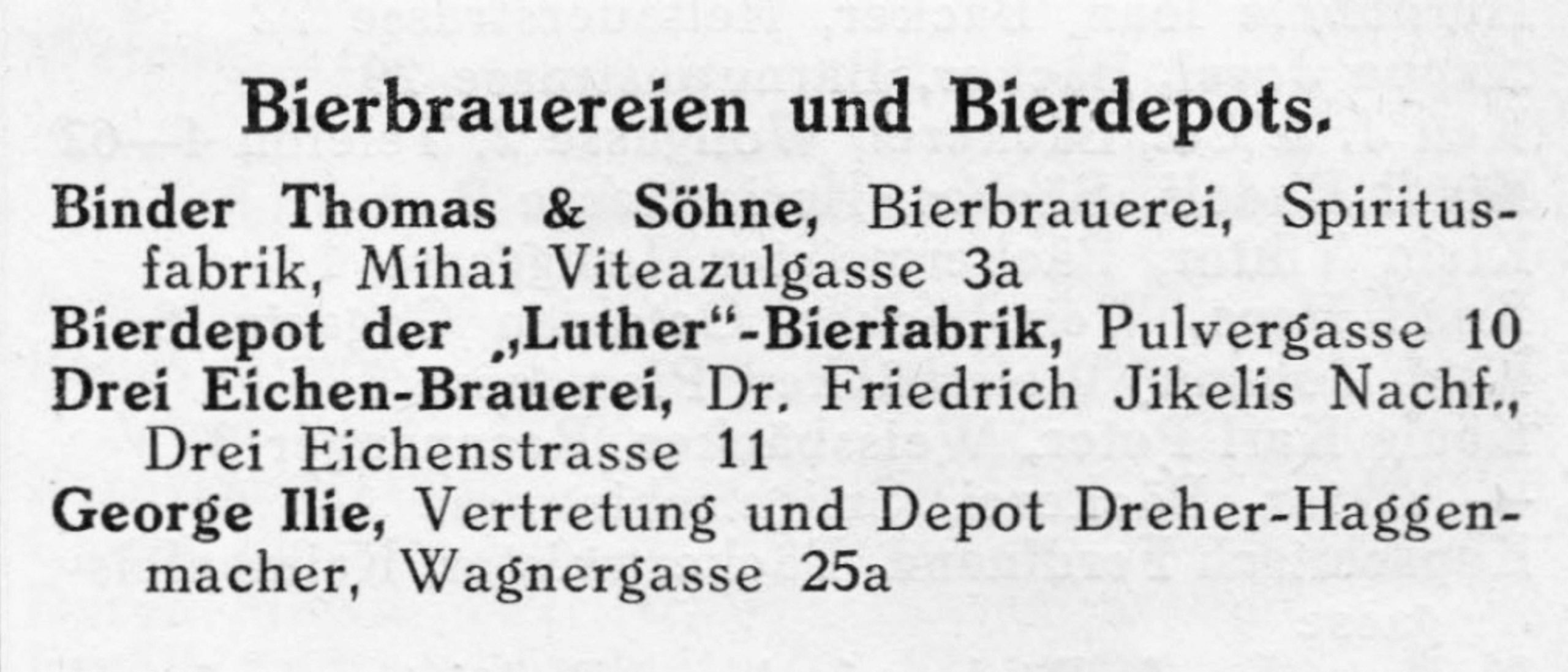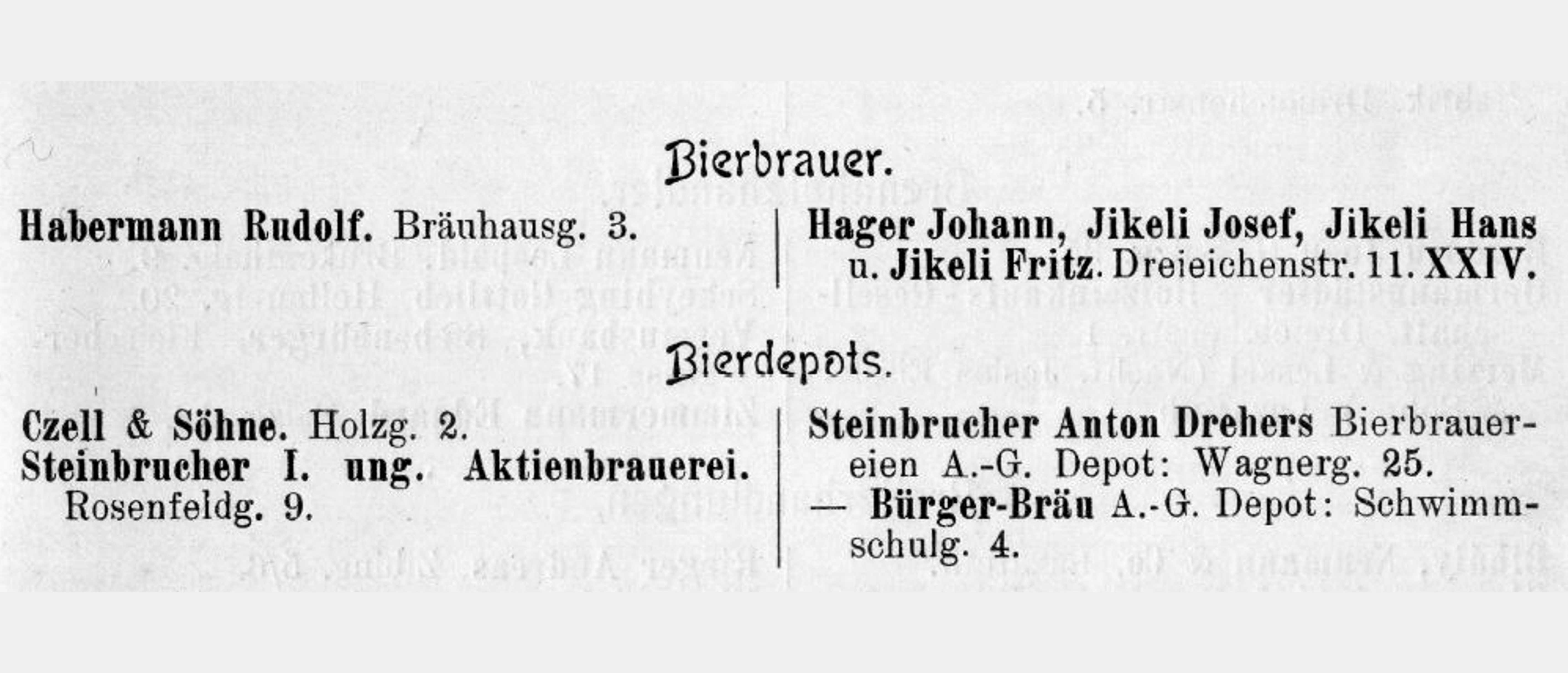 Proprietarii Fabricii de bere Trei Stejari // Drei Eichen Brauerei sunt listați în cartea de adrese din 1892, la capitolul „ Brauereibesitzer” (proprietar de fabrică de bere): Friedrich Jikeli & Johann Hager – Dreieichenstrasse 11 (Brauereibesitzer).