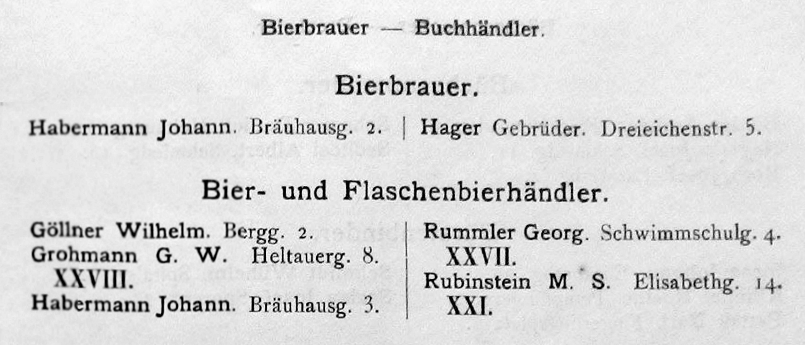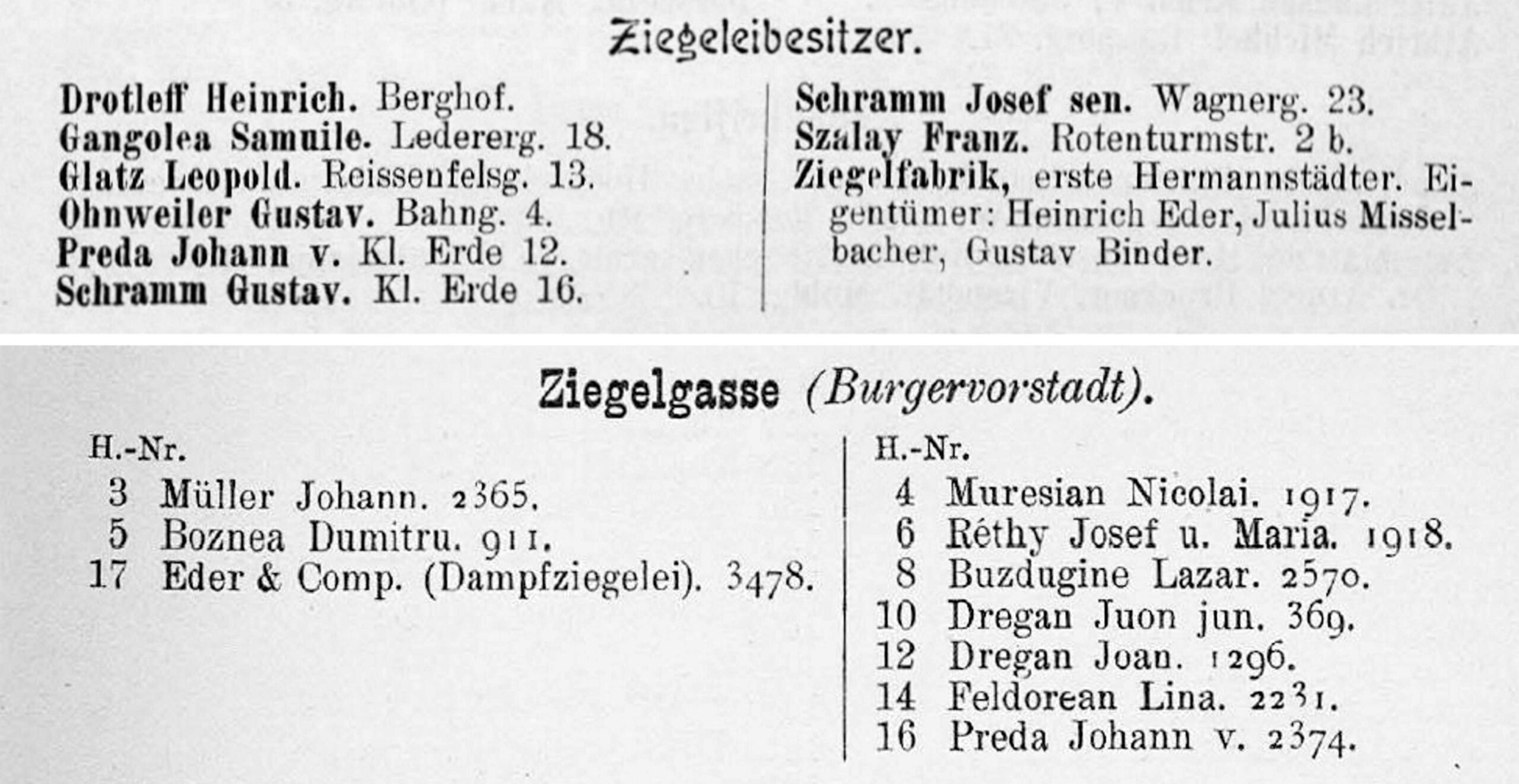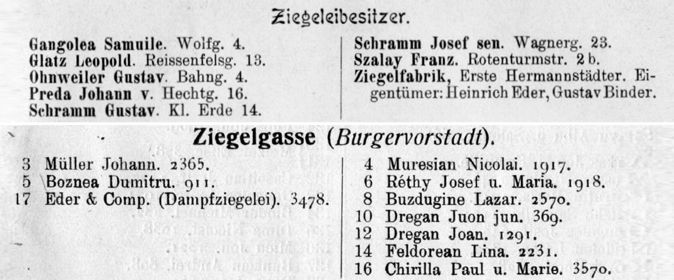 Proprietarii Fabricii de bere Trei Stejari // Drei Eichen Brauerei sunt listați în cartea de adrese din 1892, la capitolul „ Brauereibesitzer” (proprietar de fabrică de bere): Friedrich Jikeli & Johann Hager – Dreieichenstrasse 11 (Brauereibesitzer).