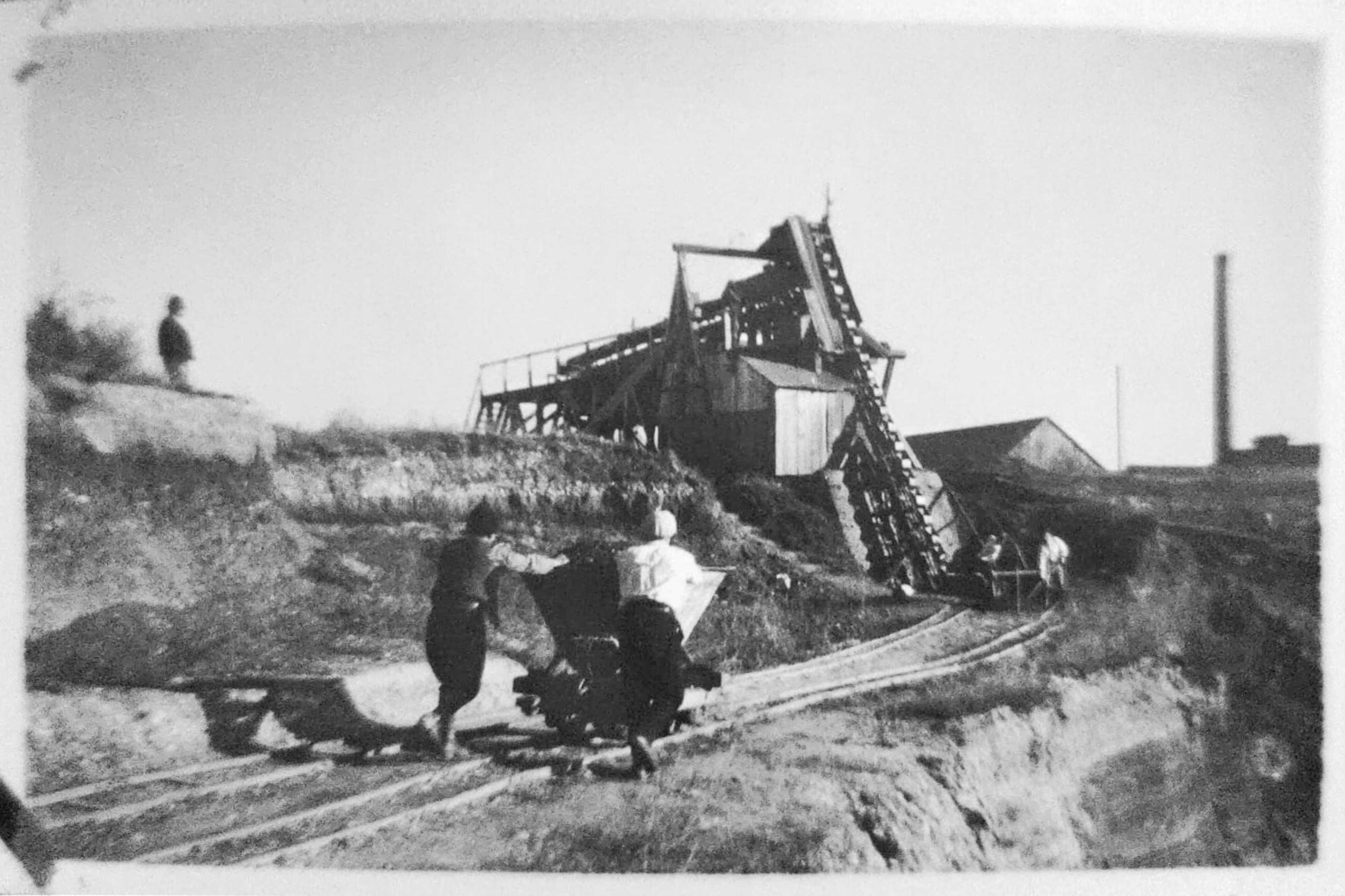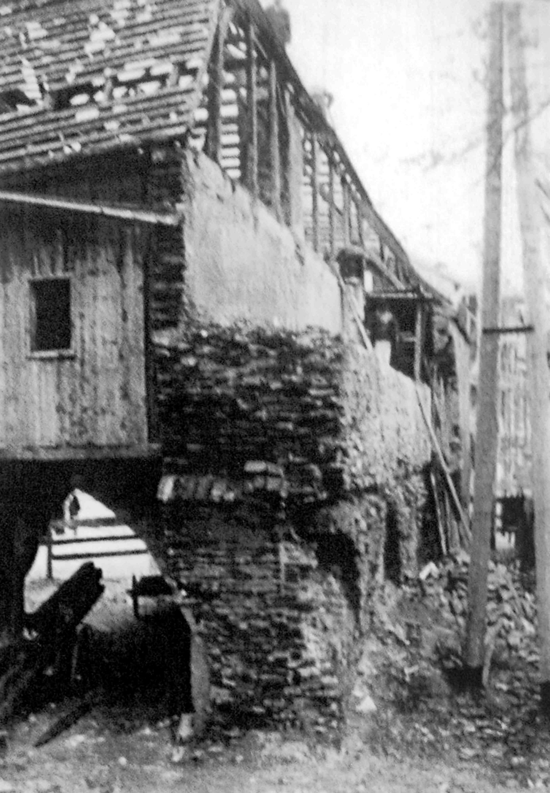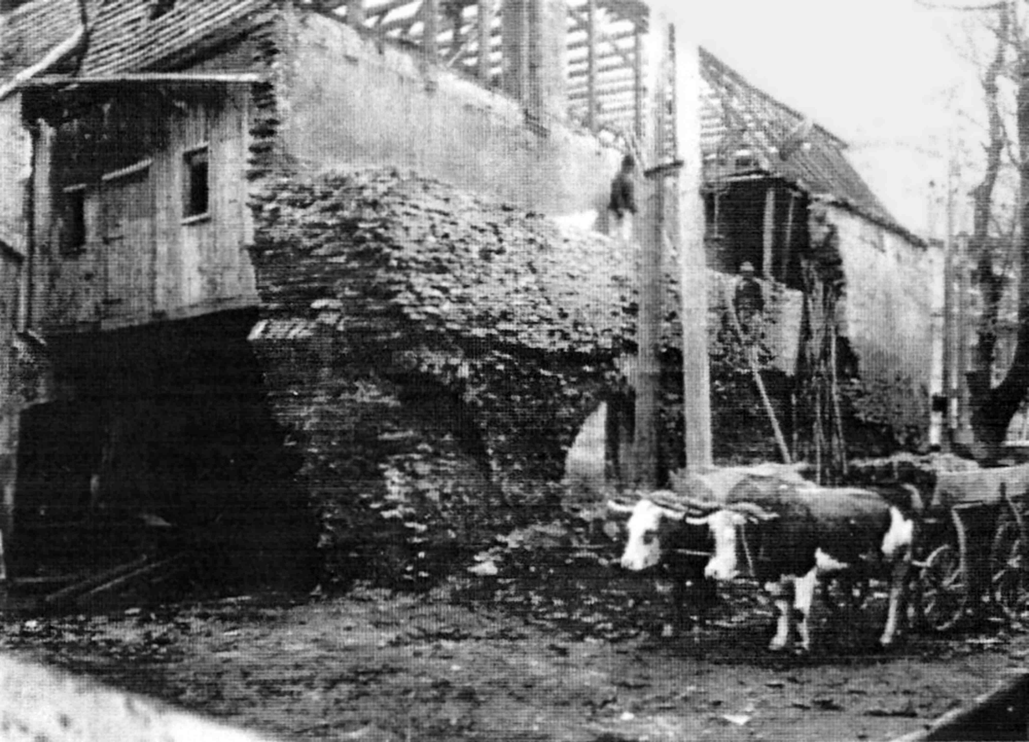 stânga: 1934, Lucrări de consolidare după inundație || Palplanșă provizorie ~ 1934, Sicherungsarbeiten nach dem Hochwasserdurchbruch || Provisorische Spundwand