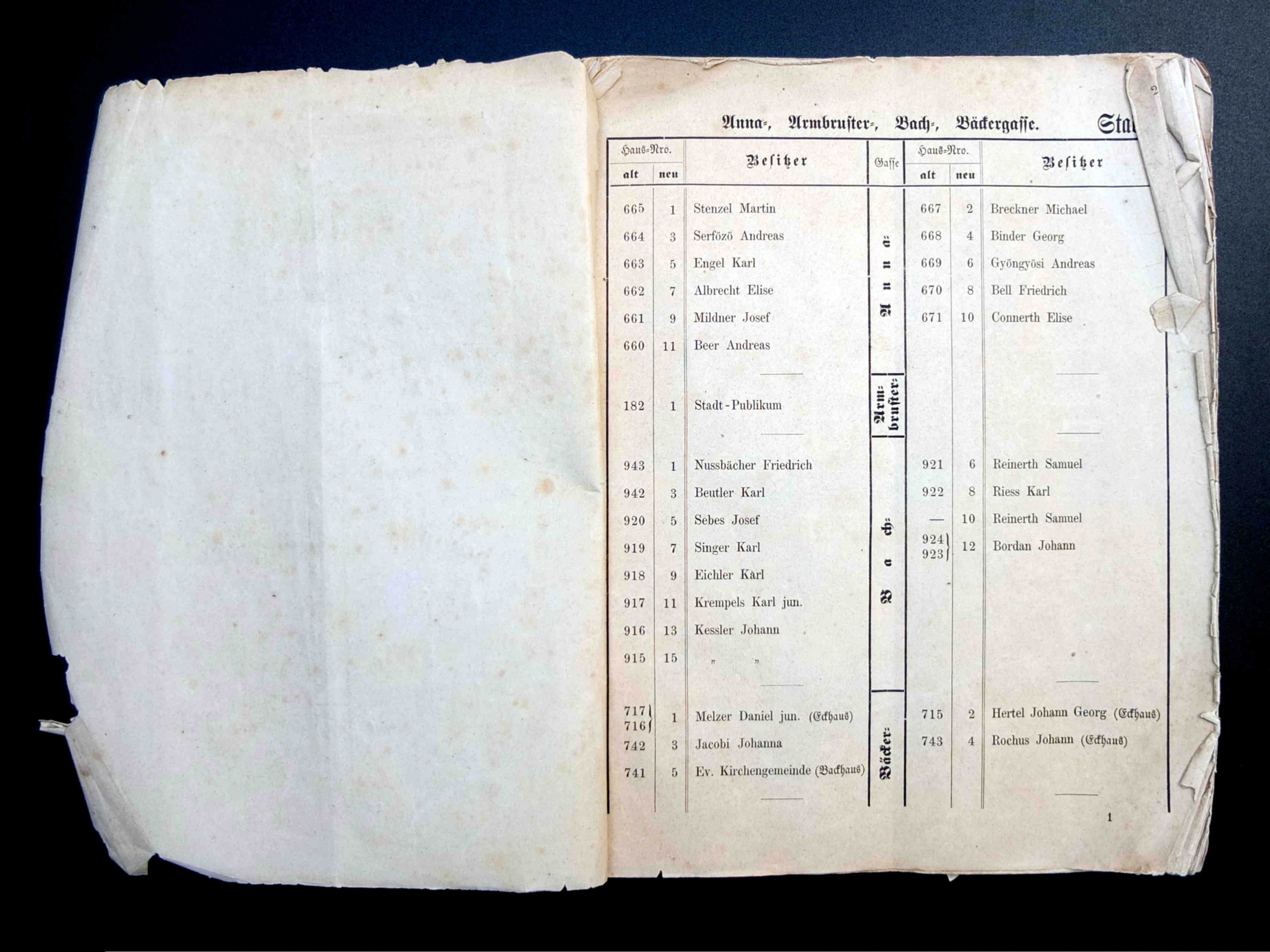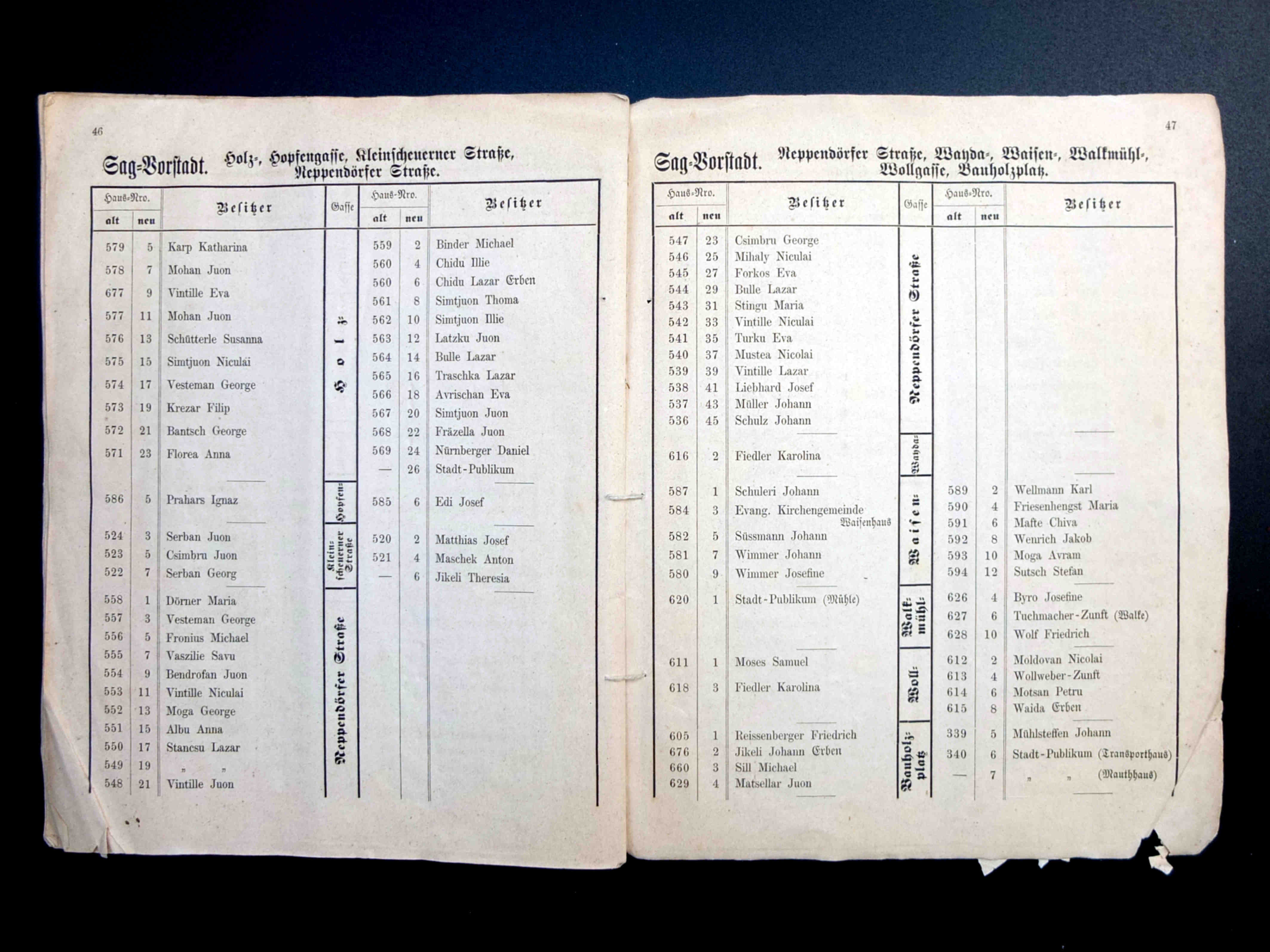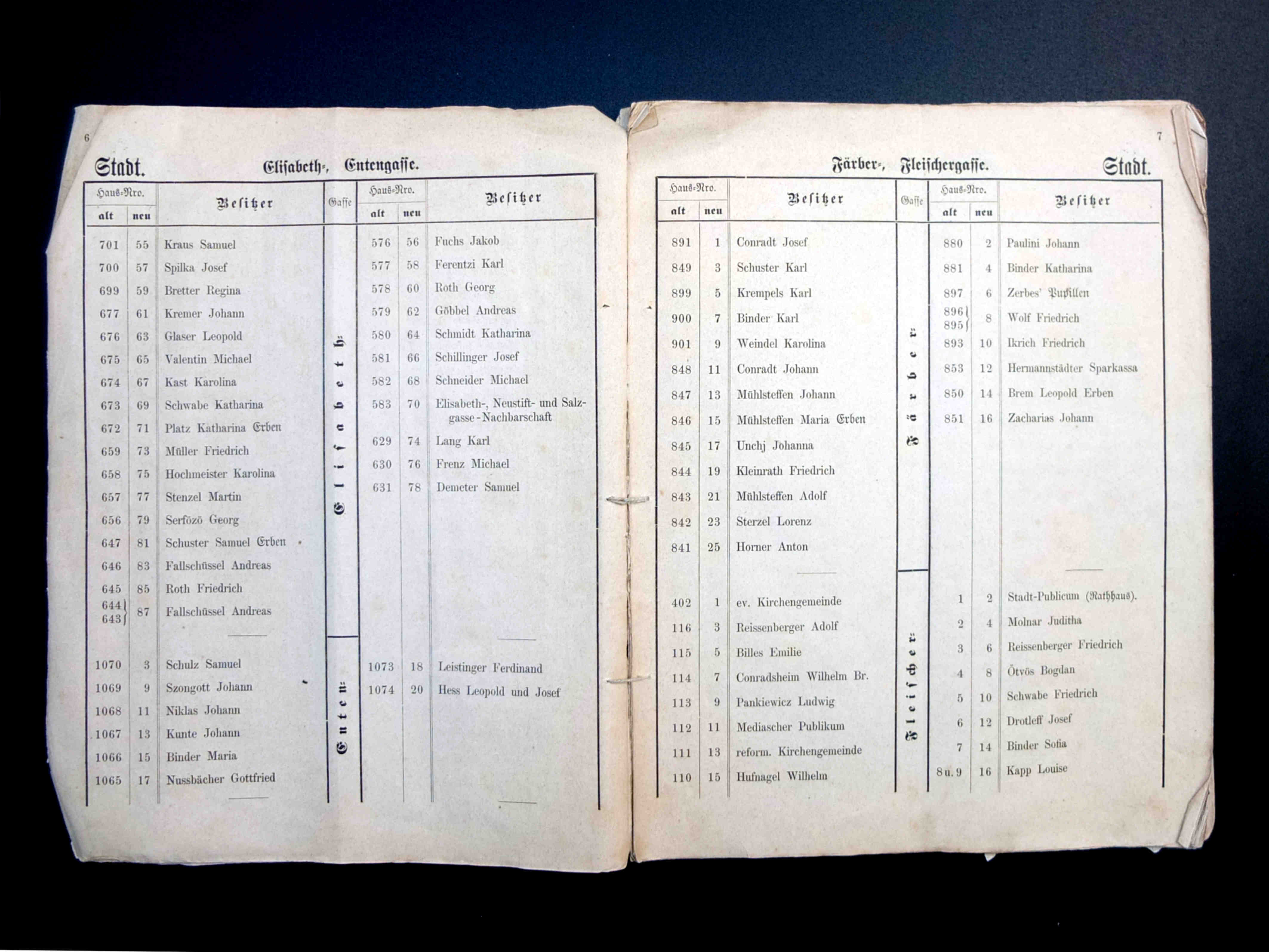 Stânga: Strada Fleischergasse // Măcelarilor / Mitropoliei fotografiată în ultimul deceniu al secolului al XIX-lea (aproximatin 1895). Spațiul comercial se afla doar la parterul corpului de clădire ridicat pe vechea parcelă strada Baiergasse No. 1 ( azi, strada Poștei ). În fundal apare vechea biserică Johanniskirche, demolată în 1910.