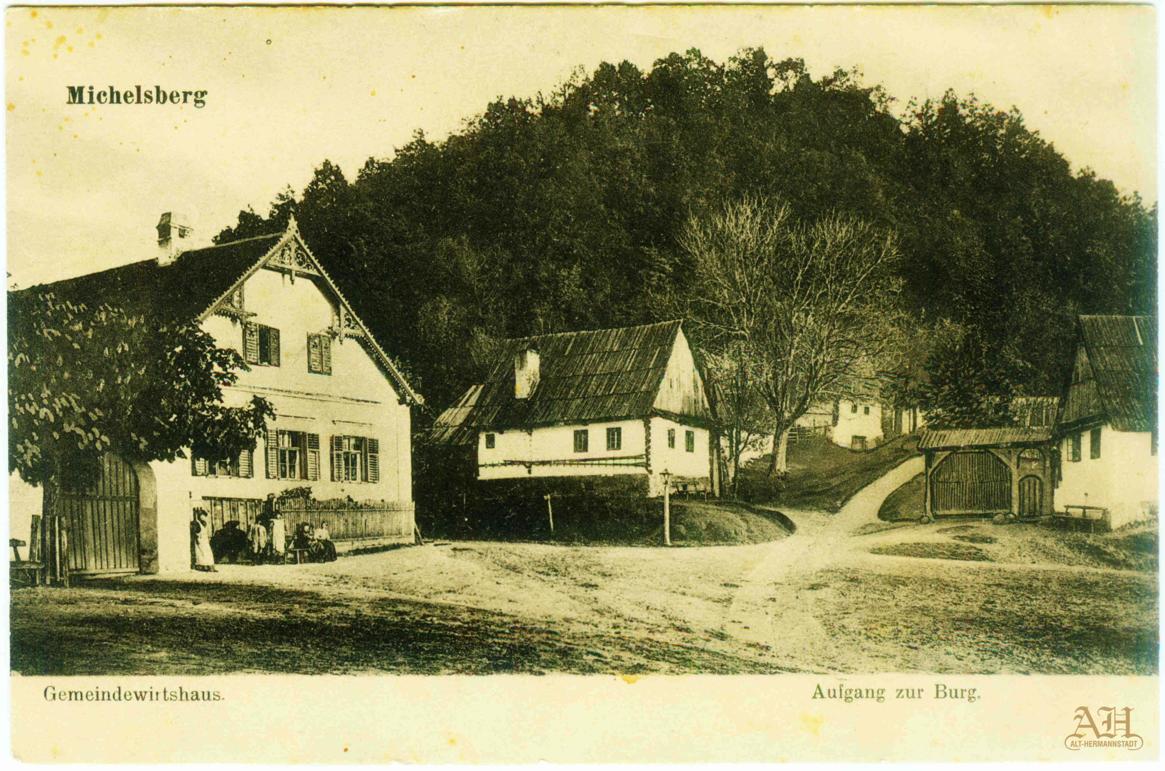 Carte poștală din perioada interbelică, realizată la editura lui Georg Meyer și distribuită la libraria din Piața Mare nr. 10. Pe față este inscriptionață cu textul: „Michelsberg – Gemeindewirtshaus – Aufgang zur Burg“ // Cisnădiaora – Cârciuma satului – Urcarea spre cetate (biserica fortificată). Pe verso se află textul: Verlag von Georg Meyer, Buchhandlung, Hermannstadt. (carte poștală din arhiva personală)