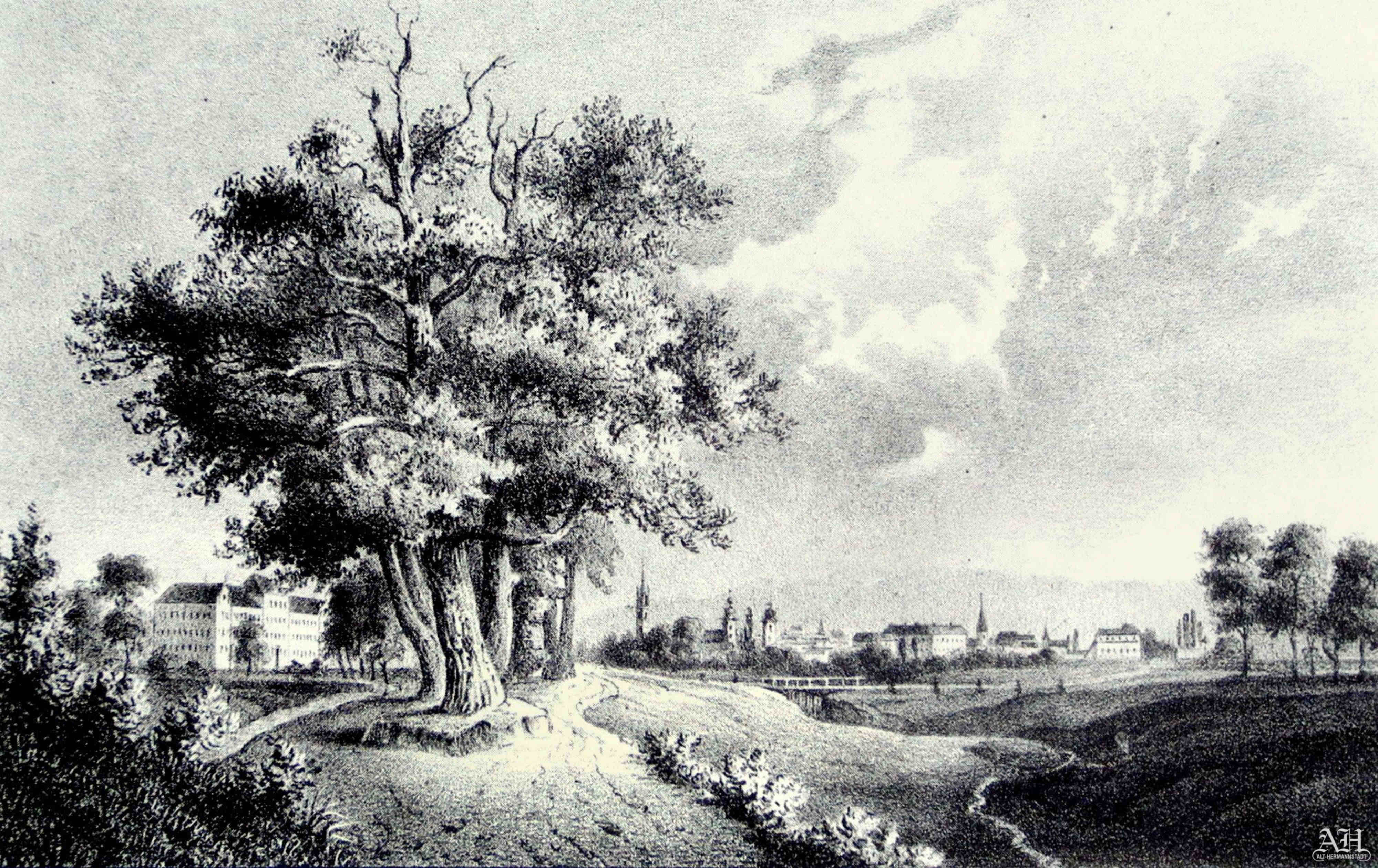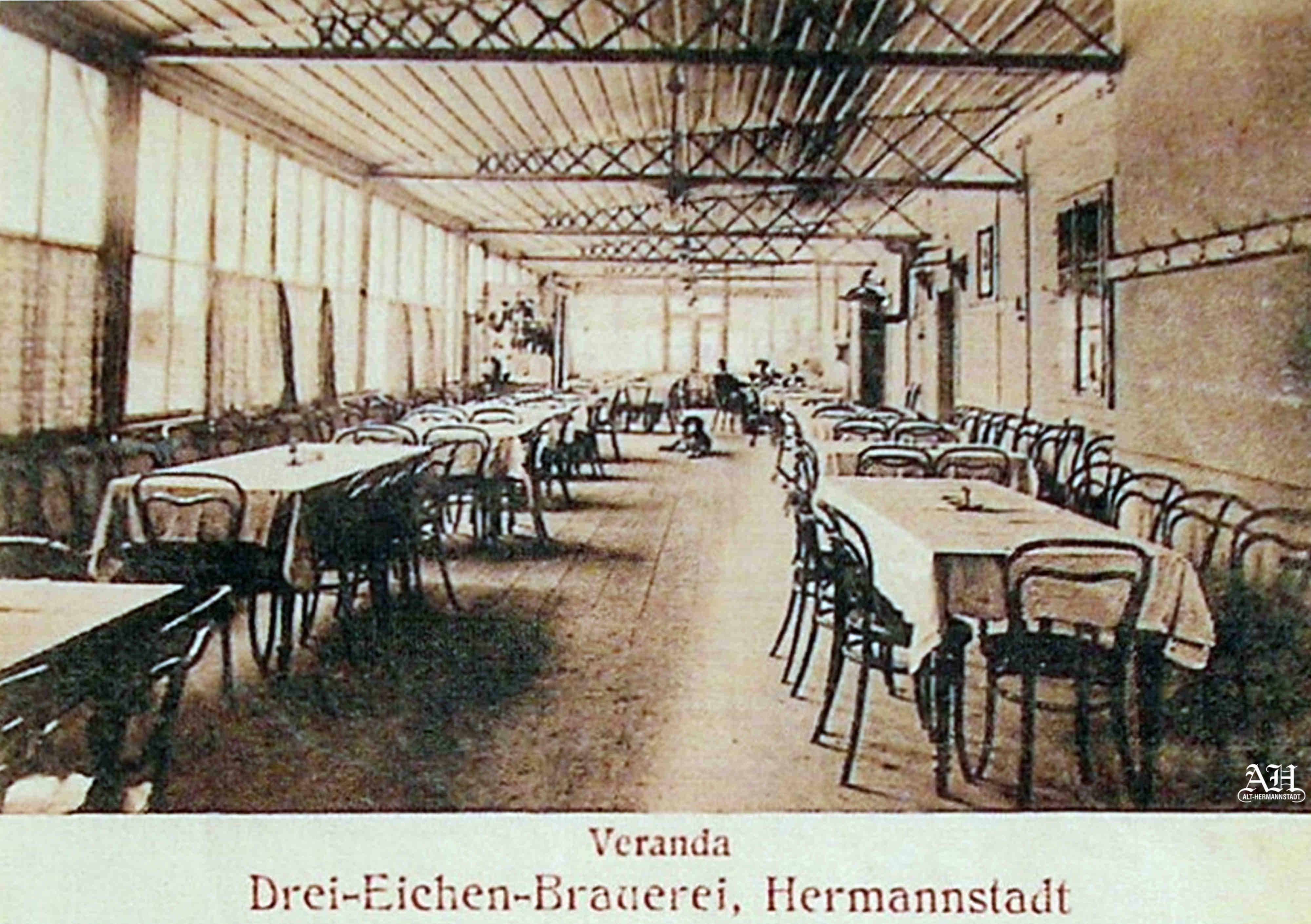 Există o ilustrație după o pictură realizată de August Sporner 1899 în care se văd clădirile fabricii de bere Trei Stejari, grădina de vară a restaurantului și pe partea dreaptă trei stejari. De la acei 3 stejari, aflați pe dâmbul de pământ lângă actuala str. Șerbota, se trage denumirea străzii Drei Eichen Strasse // Șoseaua Trei Stejari și numele fabricii de bere Drei Eichen Brauerei // Fabrica de bere Trei Stejari! Penultimul stejar a fost tăiat 1969 cu ocazia modernizării străzii Bâlea.Pe locul unde s-a construit fabrica de bere Trei Stejari 1887 funcționa deja o cârciumă, cum ne dezvăluie cărțile de adrese din 1885 și 1887. La capitolul „Wirtsgeschäfte”, cârciume/ cârciumari sunt listați:
