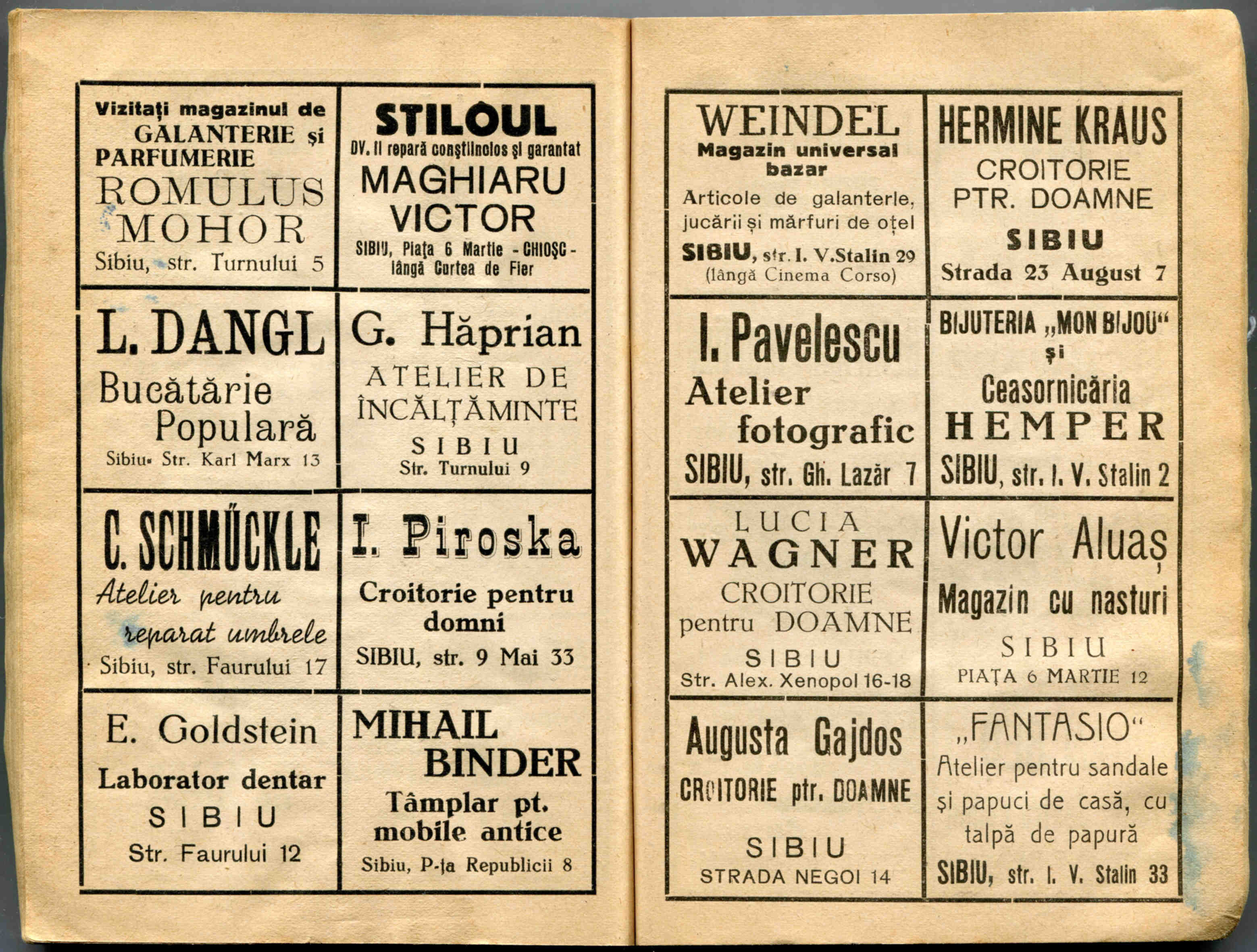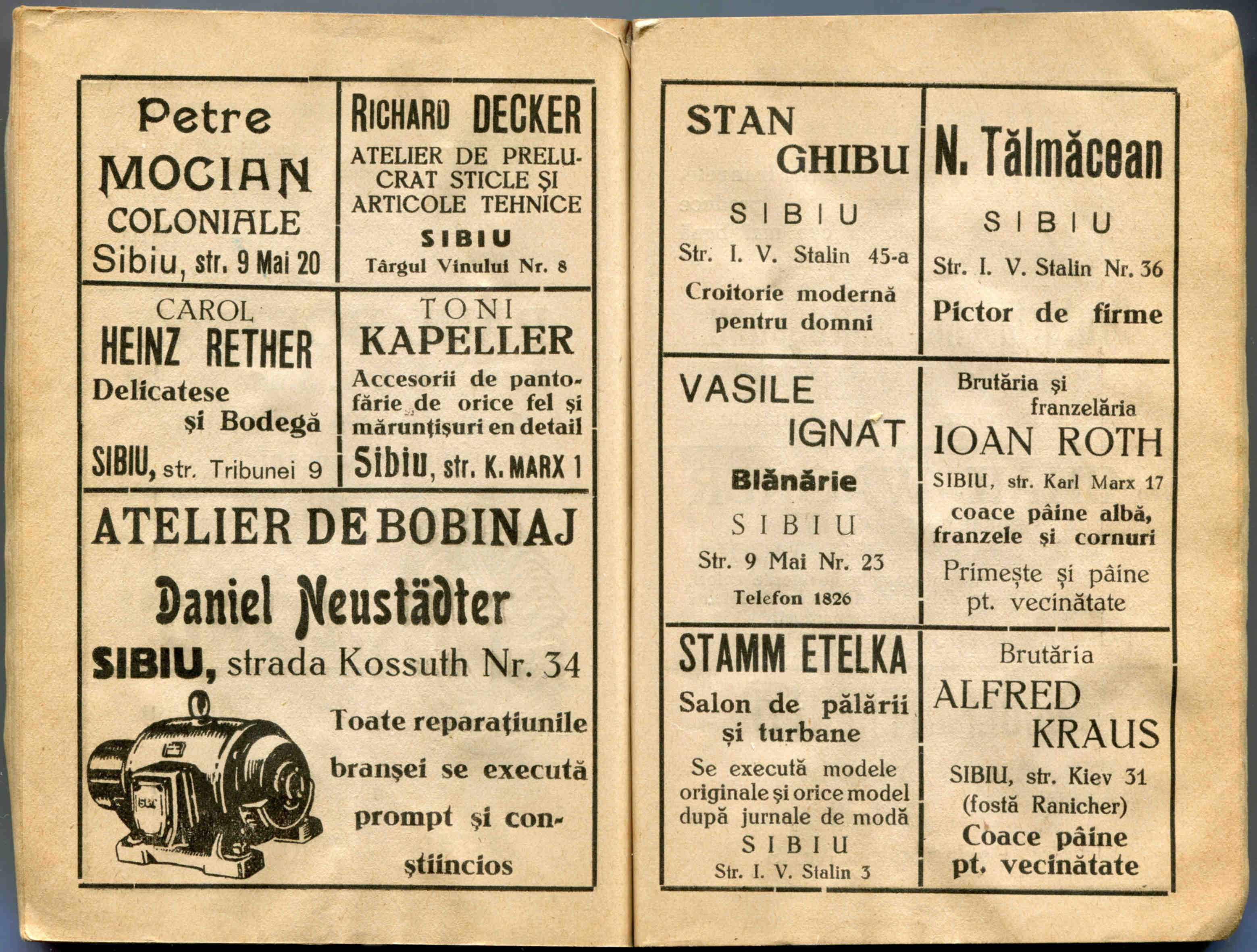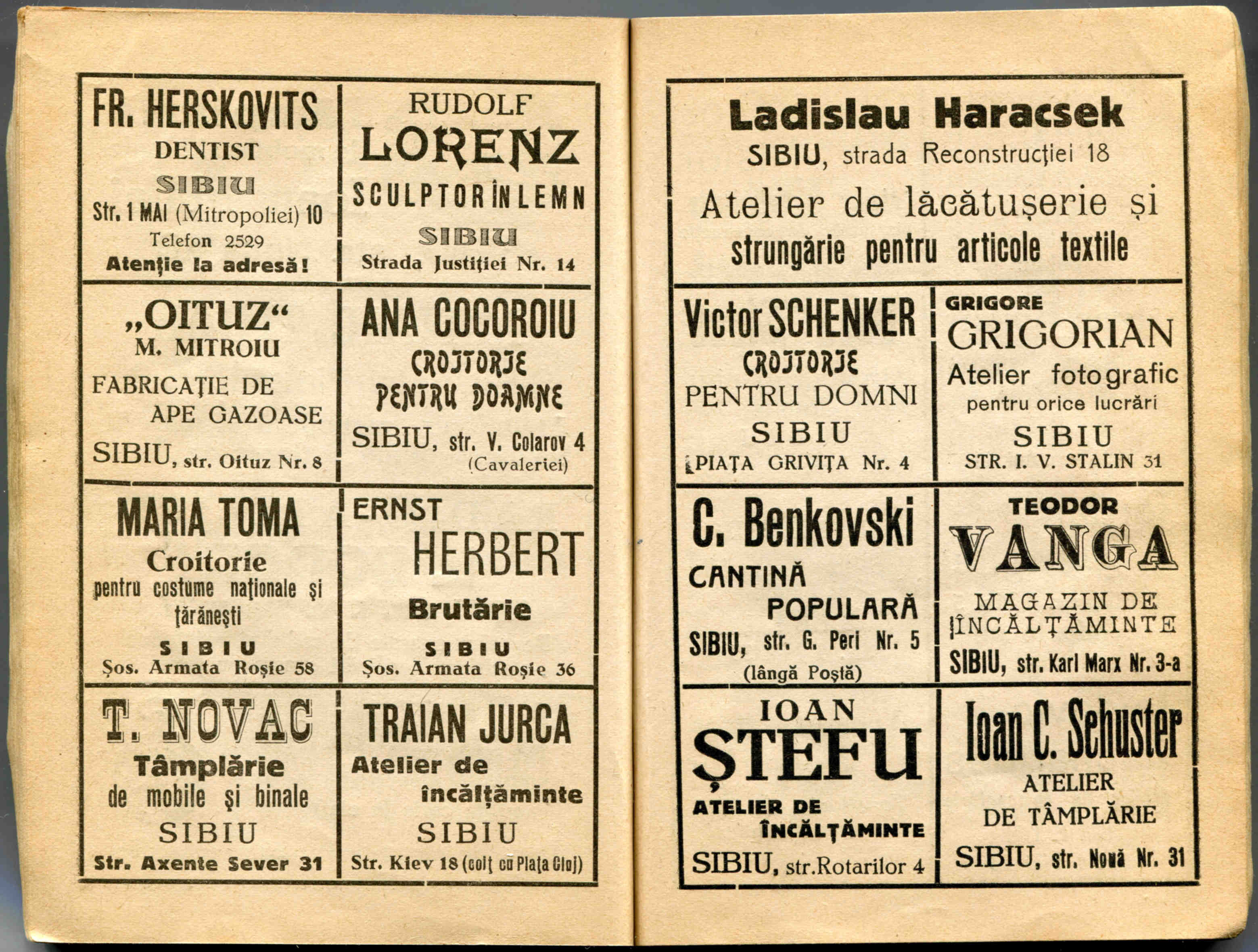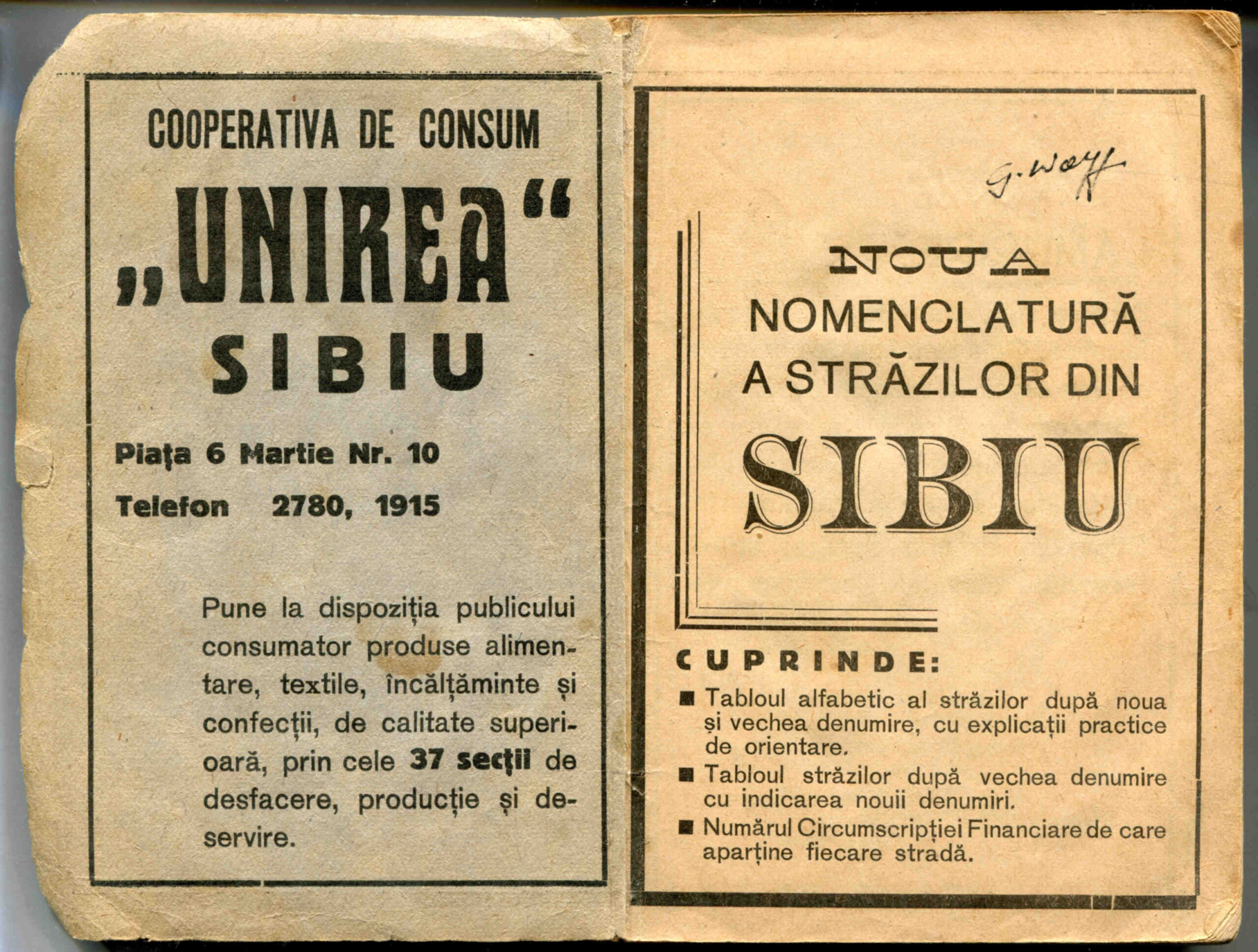 Stânga: Reclamă comercială din cartea de adrese din 1908, la magazinul cu depozit produse de băcănie, delicatese și mărfuri de coloniale ( spițerie ) Victor Onițiu care a funcționat la parterul clădirii băncii Albina, strada Fleischergasse Nr. 20 / Măcelarilor nr. 20, ( azi Mitropoliei 16 ).