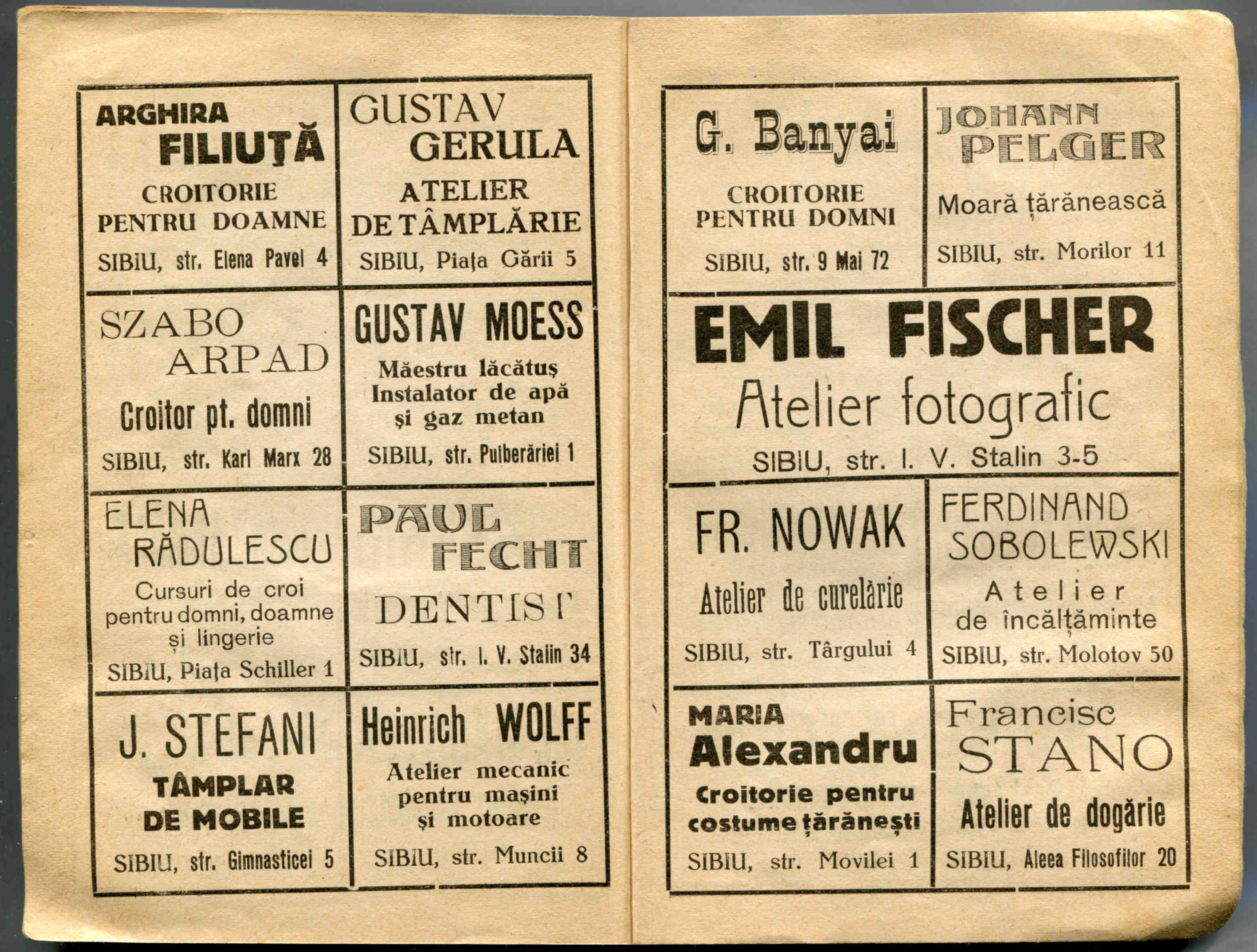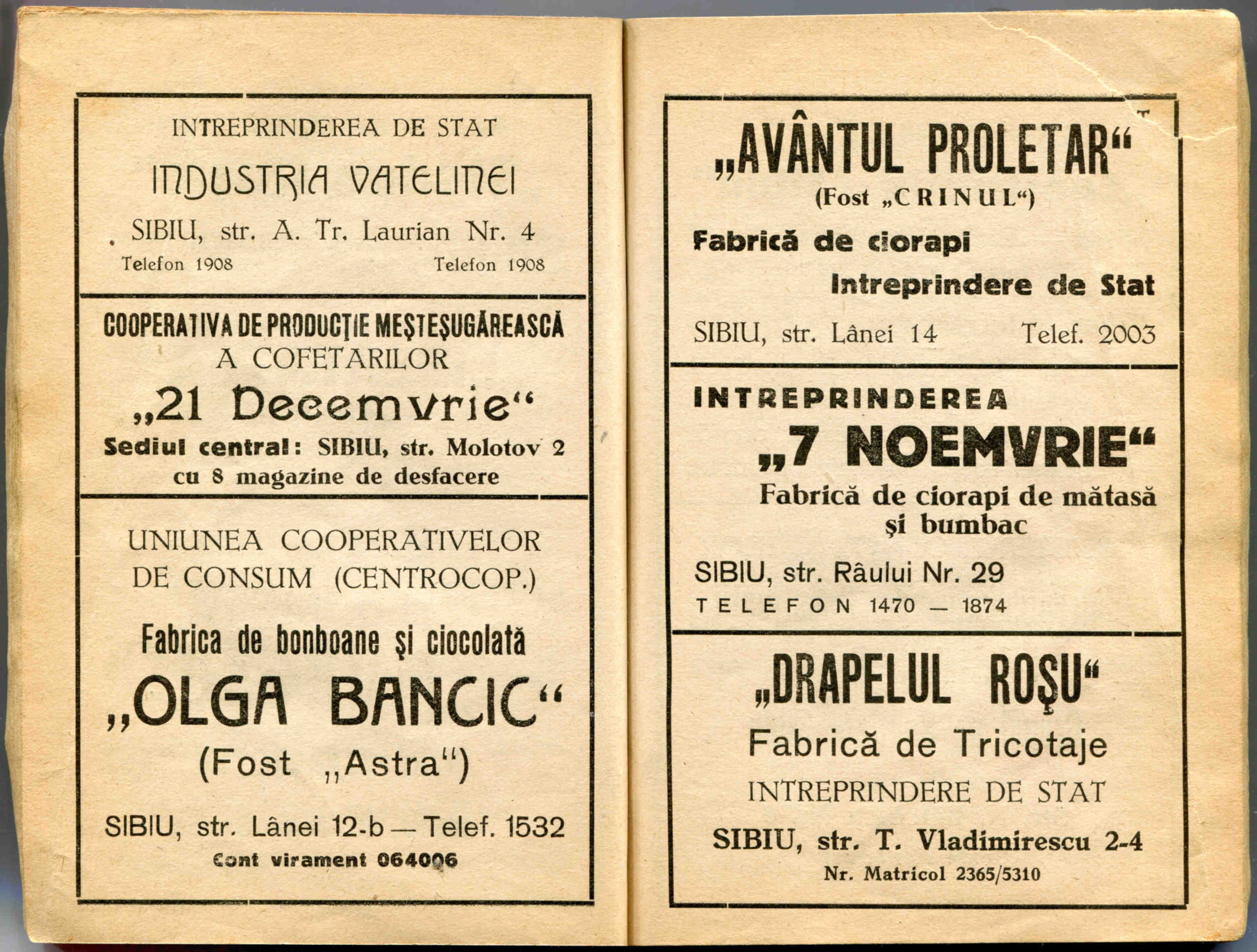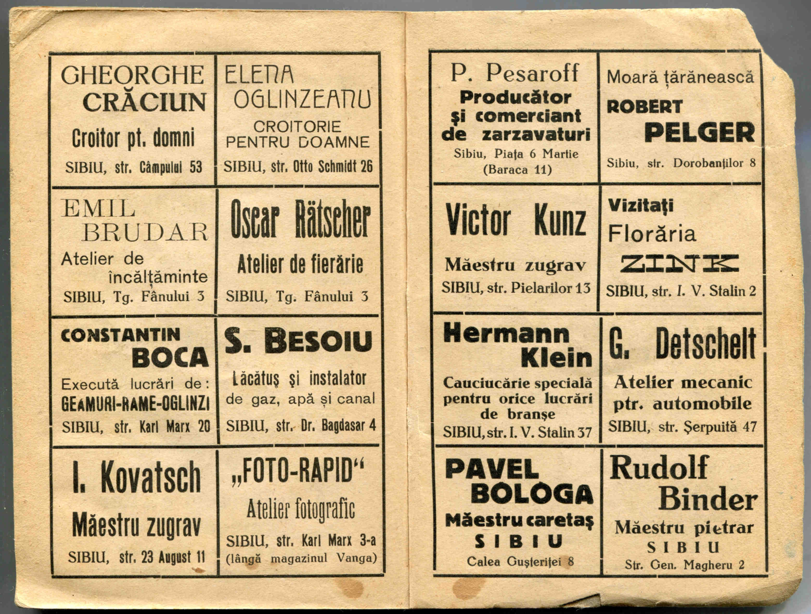Stânga: Reclamă comercială din cartea de adrese din 1908, la magazinul cu depozit produse de băcănie, delicatese și mărfuri de coloniale ( spițerie ) Victor Onițiu care a funcționat la parterul clădirii băncii Albina, strada Fleischergasse Nr. 20 / Măcelarilor nr. 20, ( azi Mitropoliei 16 ).