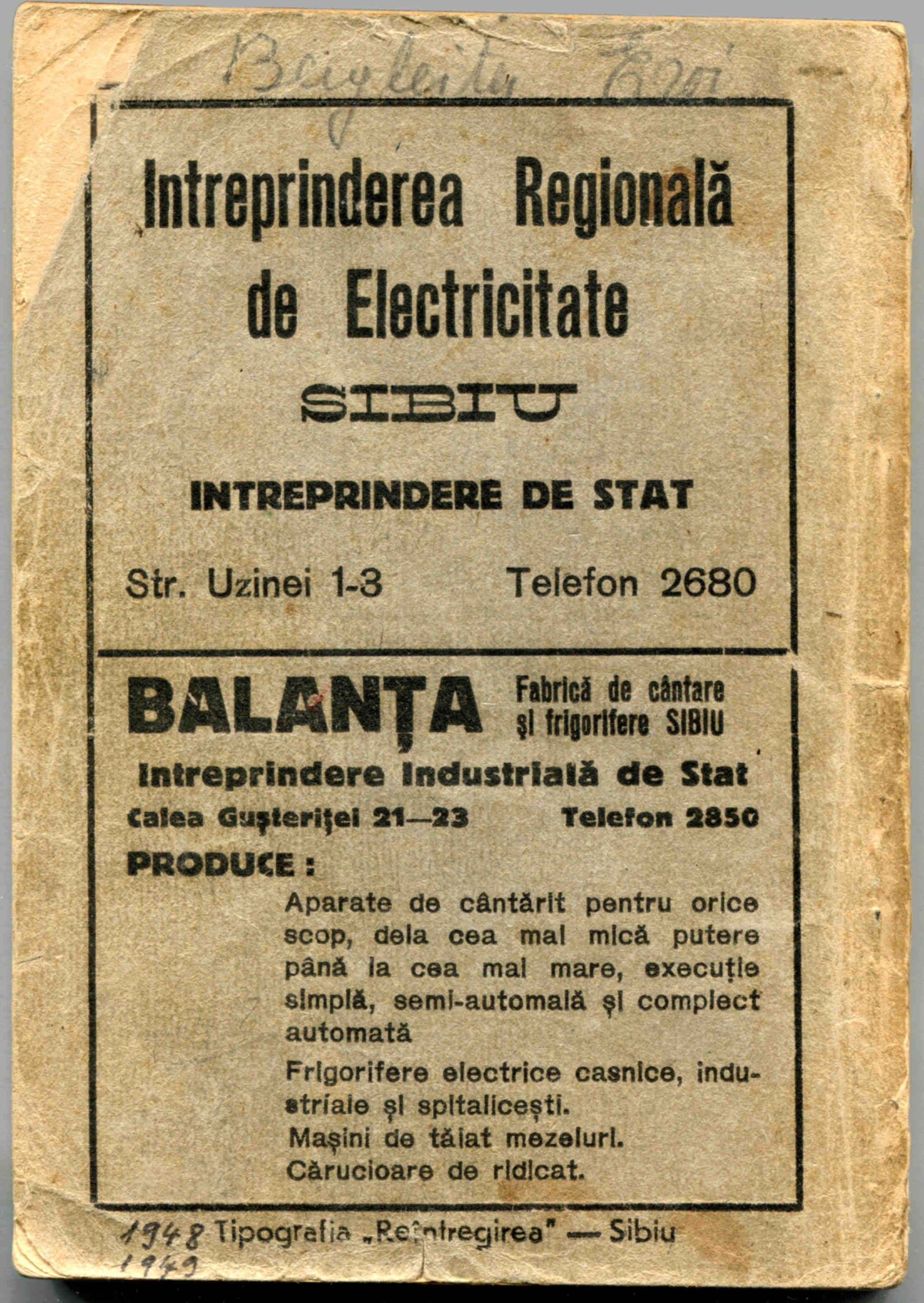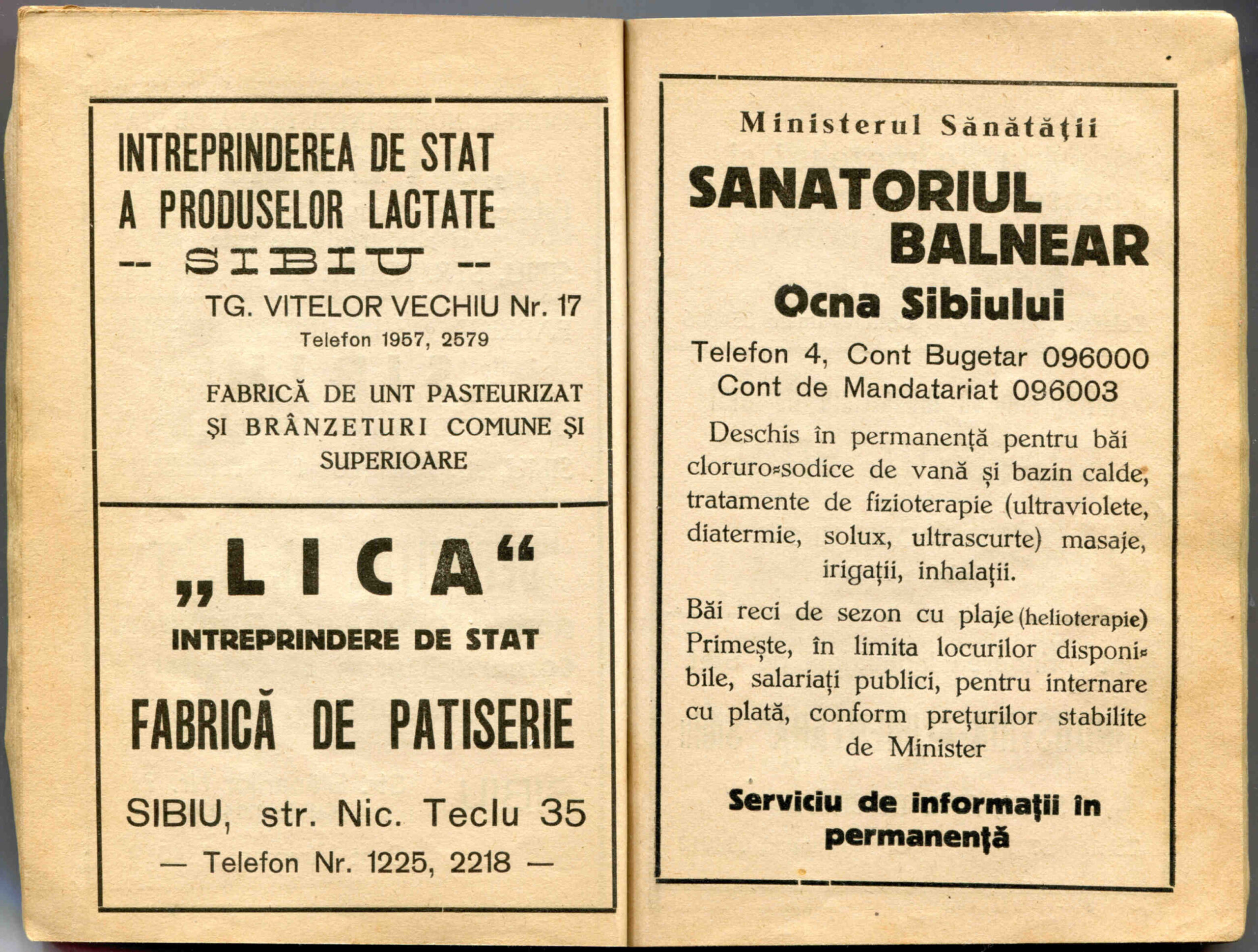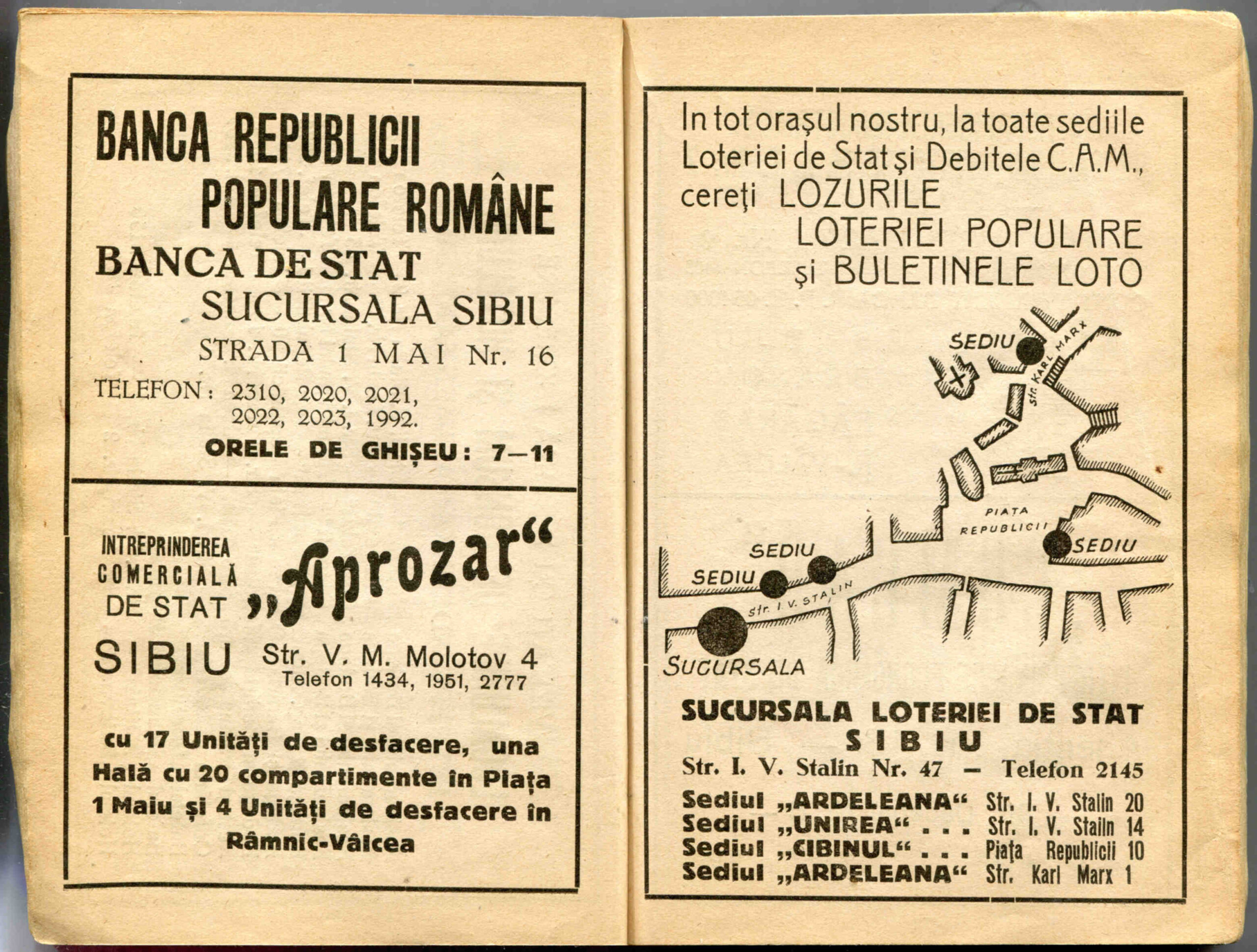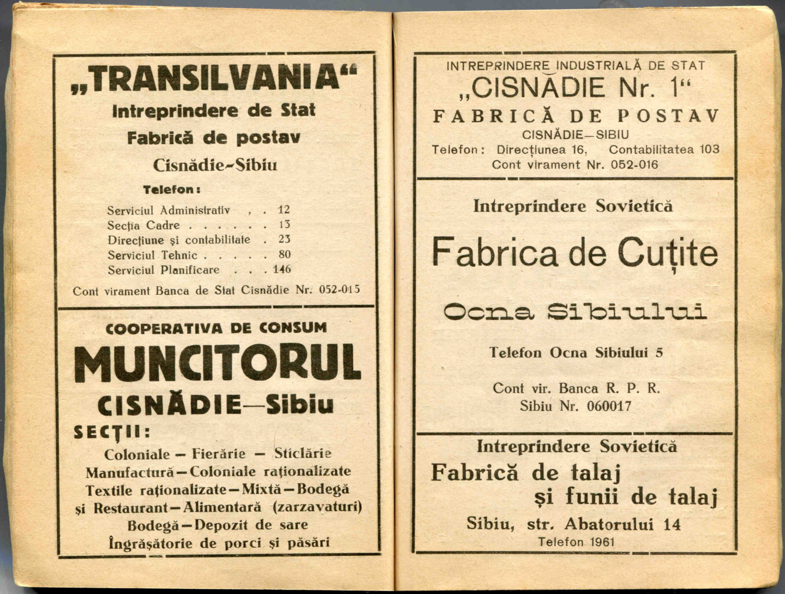 Stânga: Reclamă comercială din cartea de adrese din 1908, la magazinul cu depozit produse de băcănie, delicatese și mărfuri de coloniale ( spițerie ) Victor Onițiu care a funcționat la parterul clădirii băncii Albina, strada Fleischergasse Nr. 20 / Măcelarilor nr. 20, ( azi Mitropoliei 16 ).