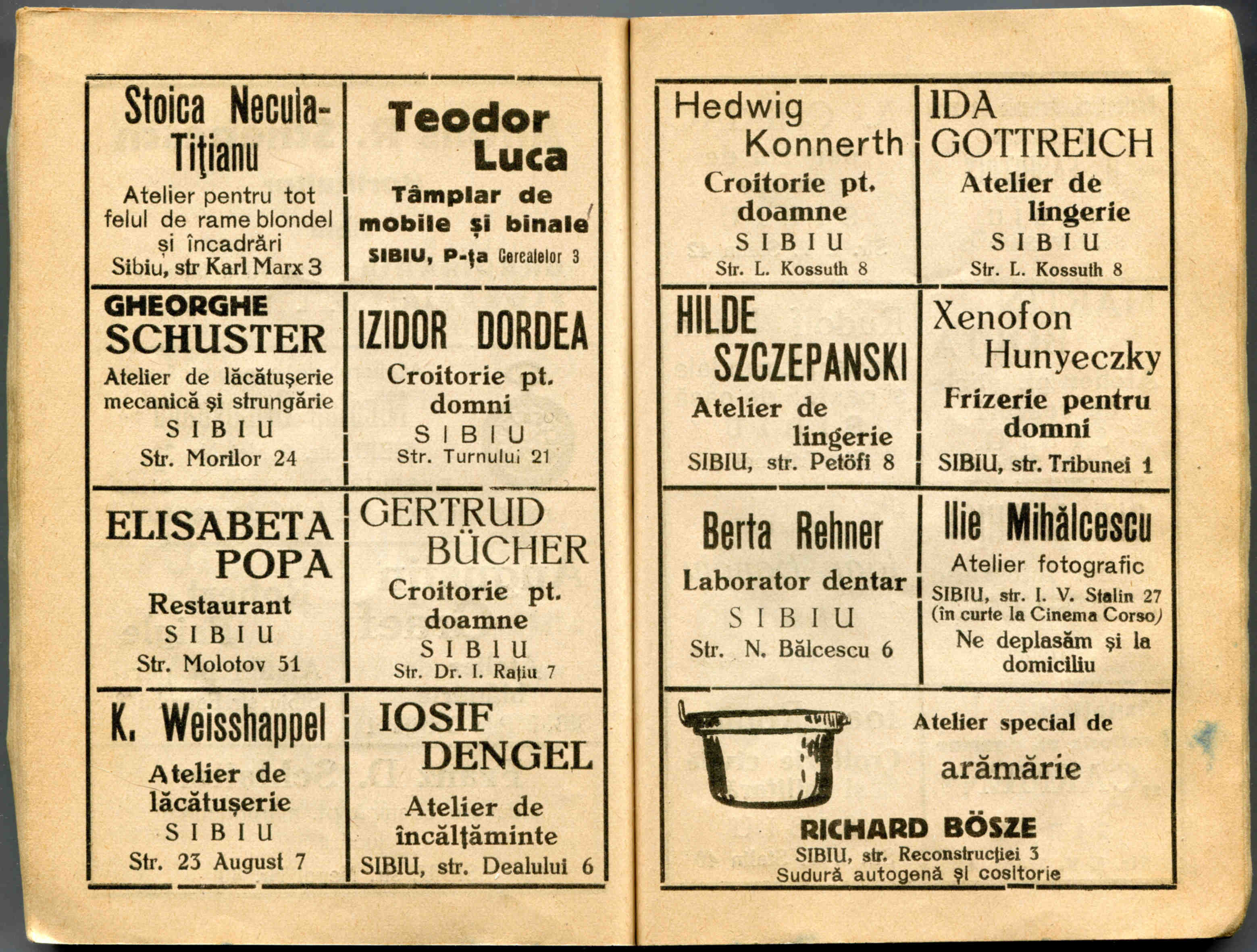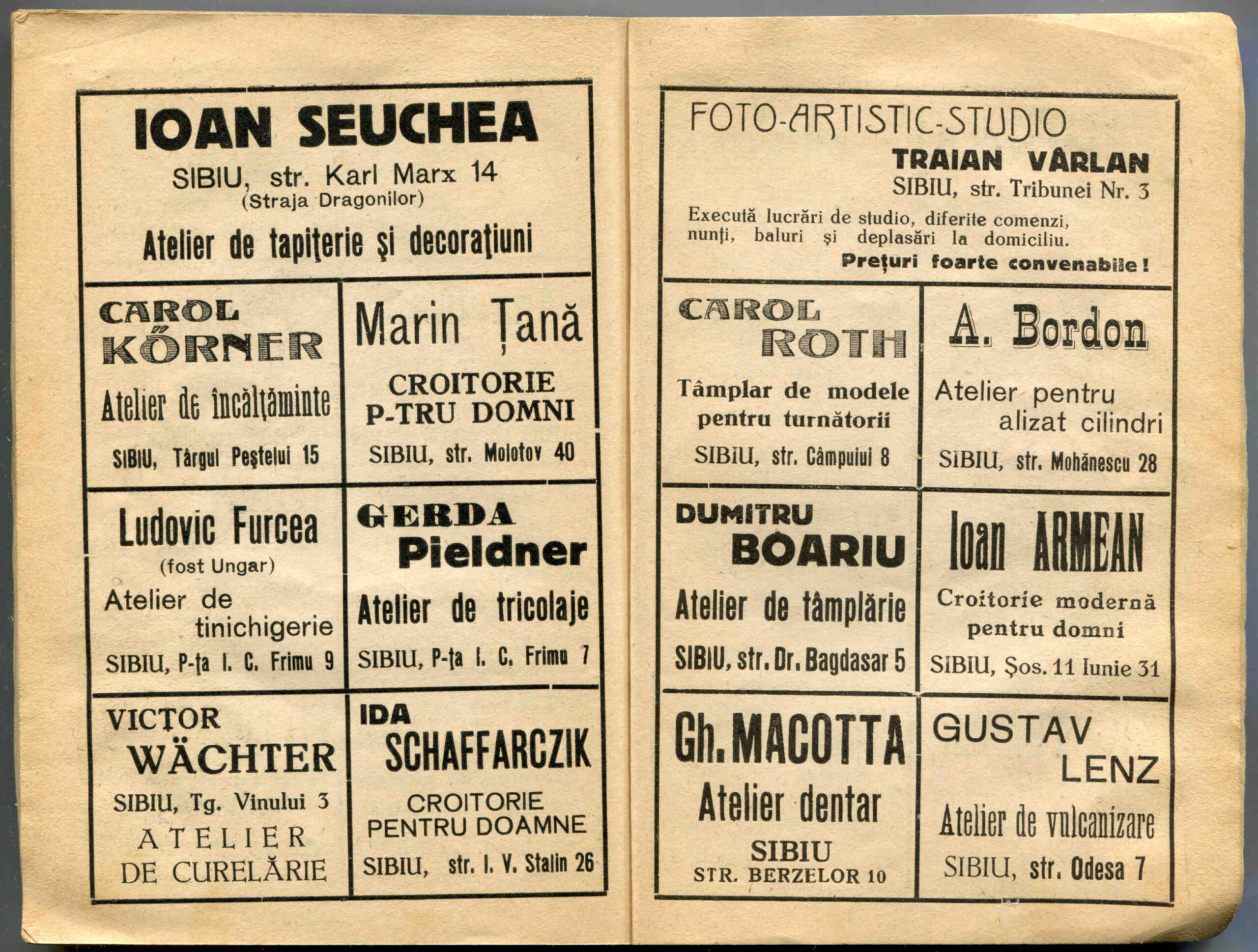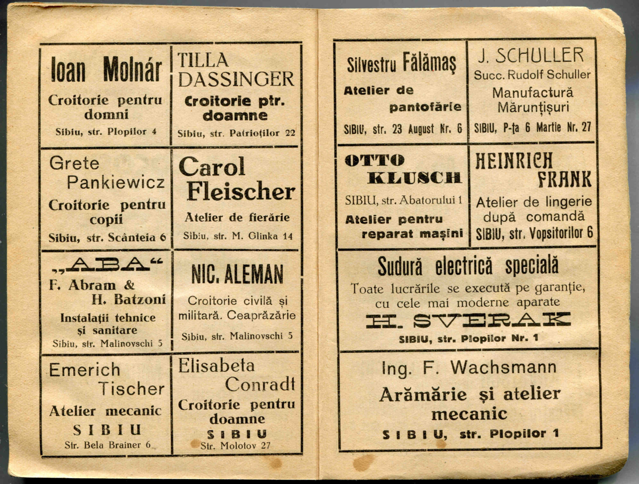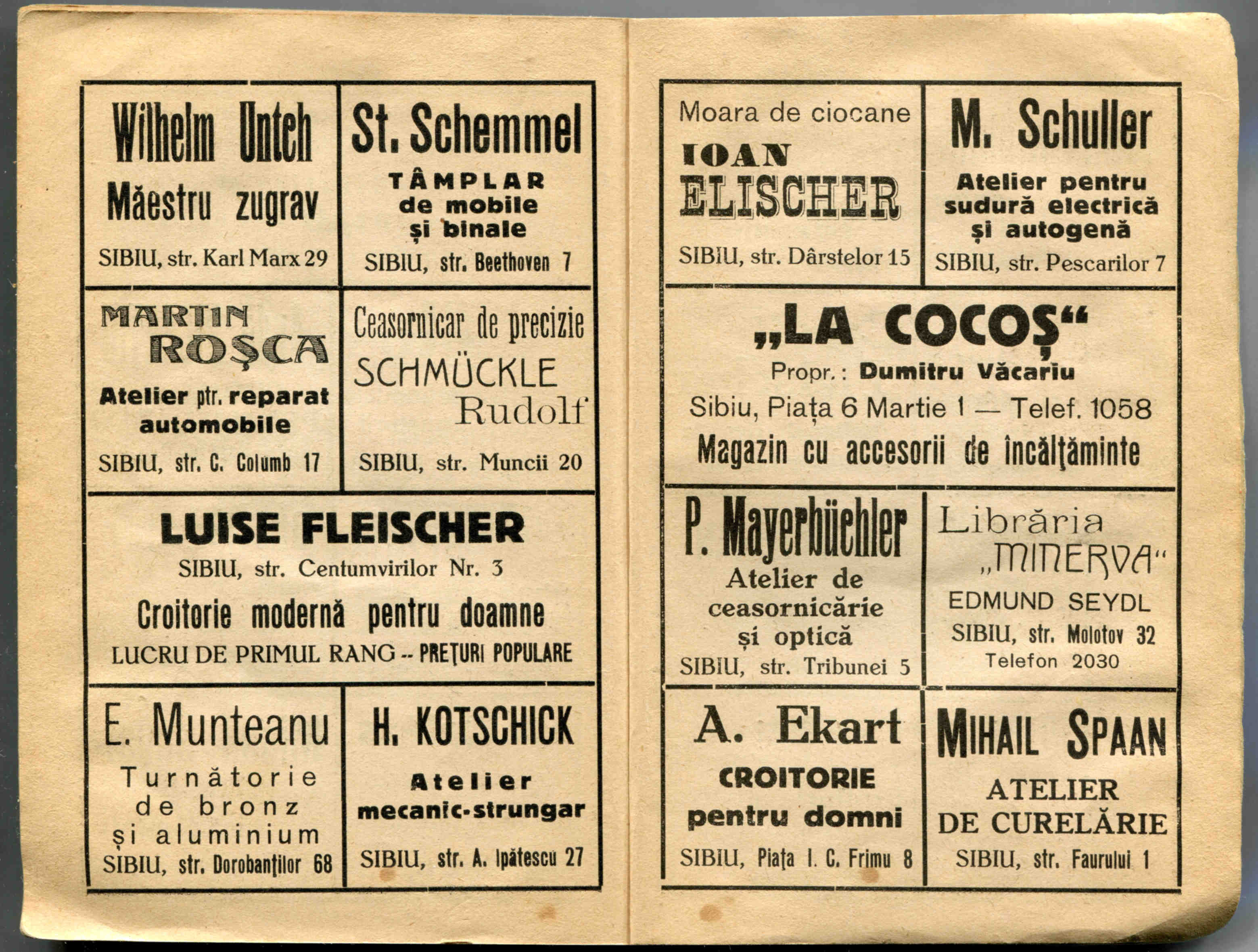 Stânga: Reclamă comercială din cartea de adrese din 1898, la magazinul societății comerciale pe acțiuni „Concordia” care funcționa la parterul clădirii băncii Albina, strada Fleischergasse / Măcelarilor nr. 20, ( azi Mitropoliei 16 ).