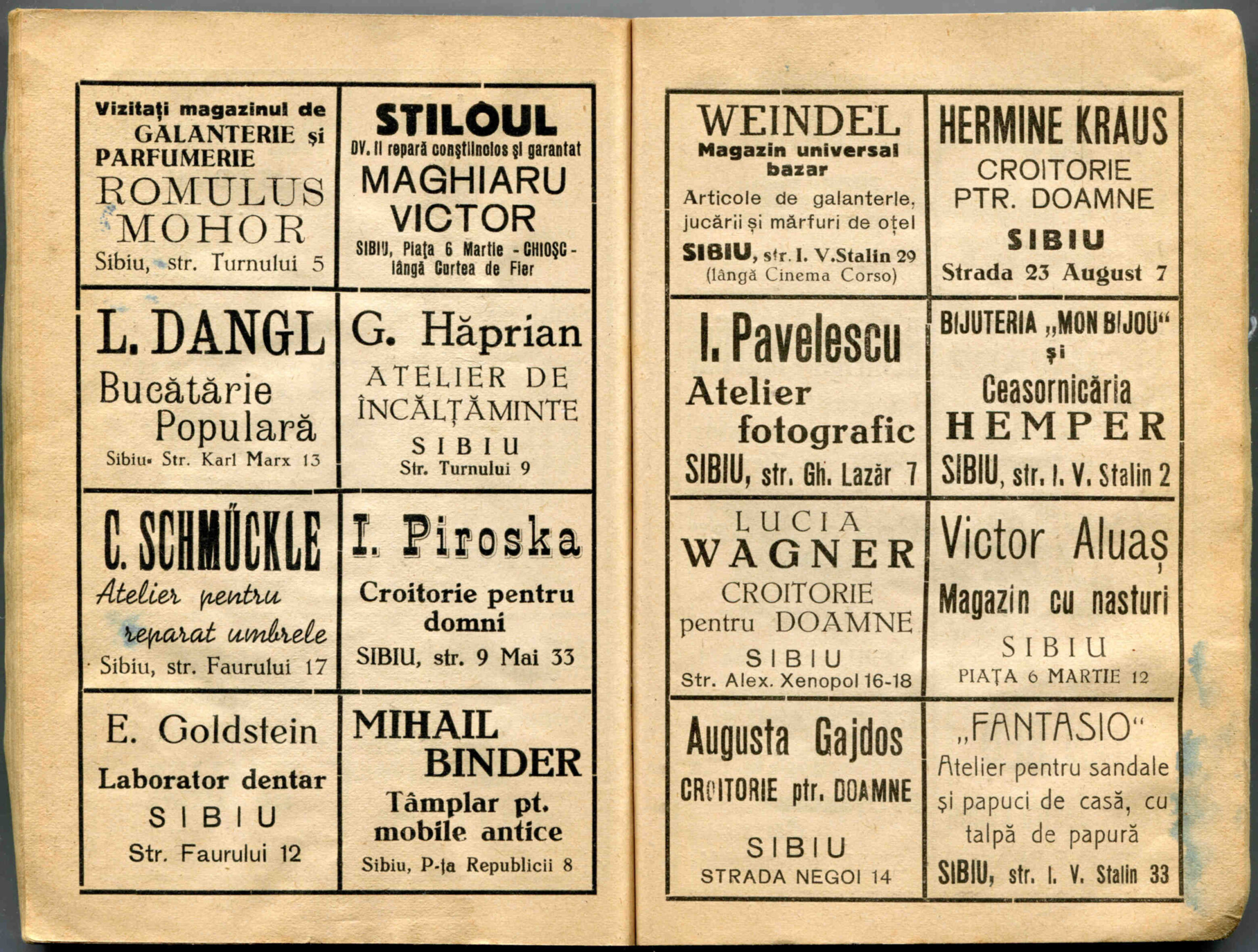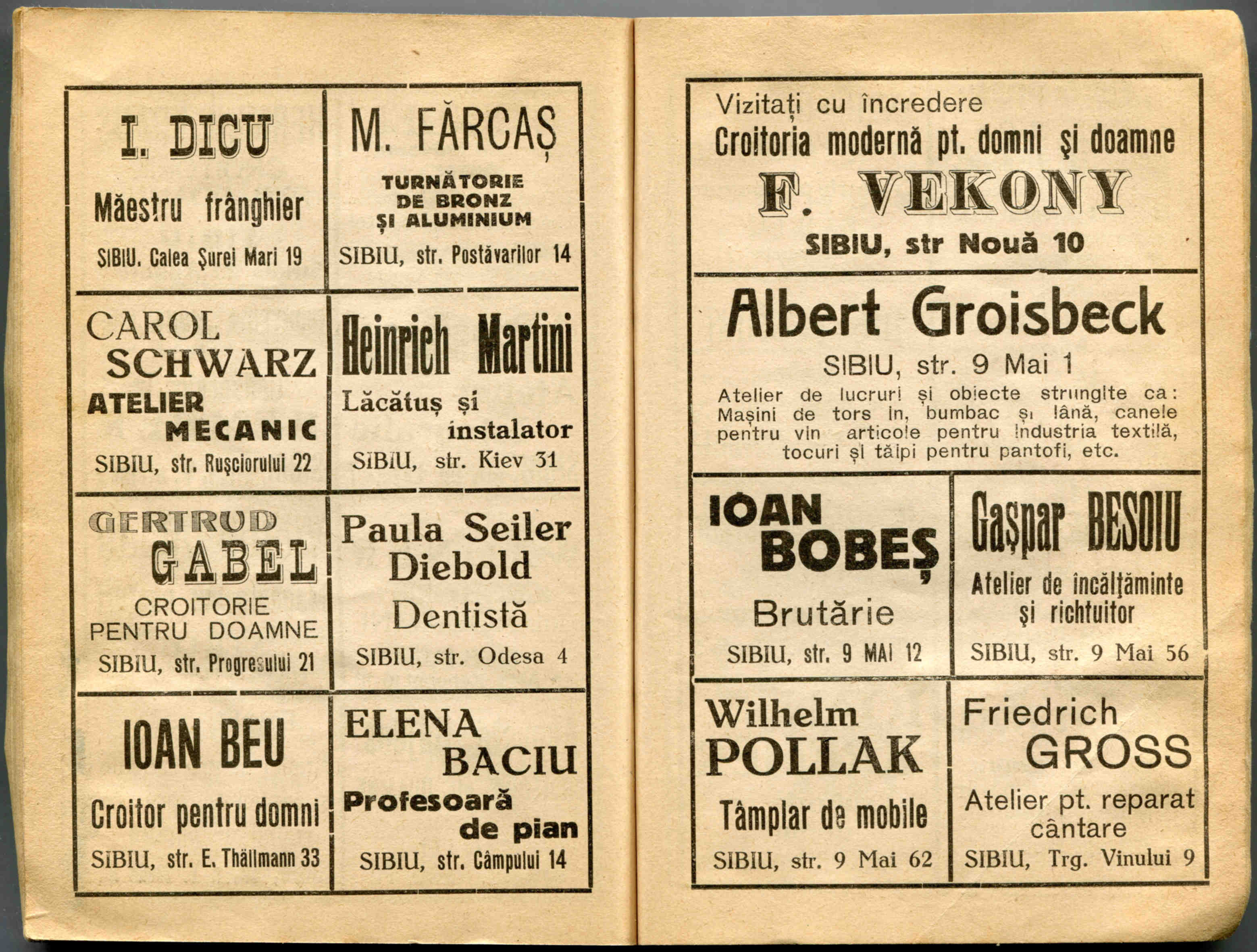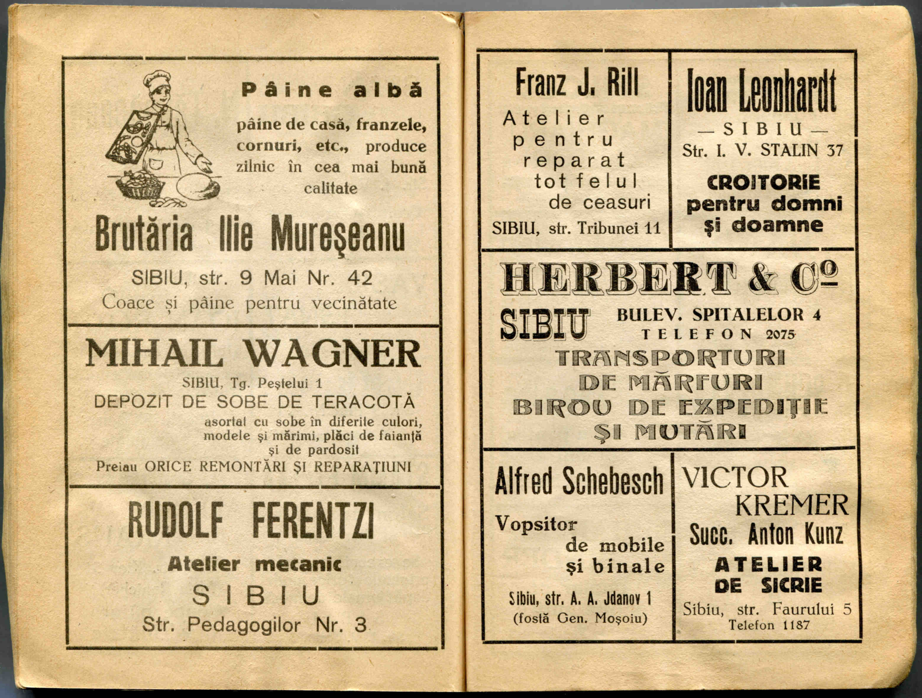 Stânga: Reclamă comercială din cartea de adrese din 1898, la magazinul societății comerciale pe acțiuni „Concordia” care funcționa la parterul clădirii băncii Albina, strada Fleischergasse / Măcelarilor nr. 20, ( azi Mitropoliei 16 ).