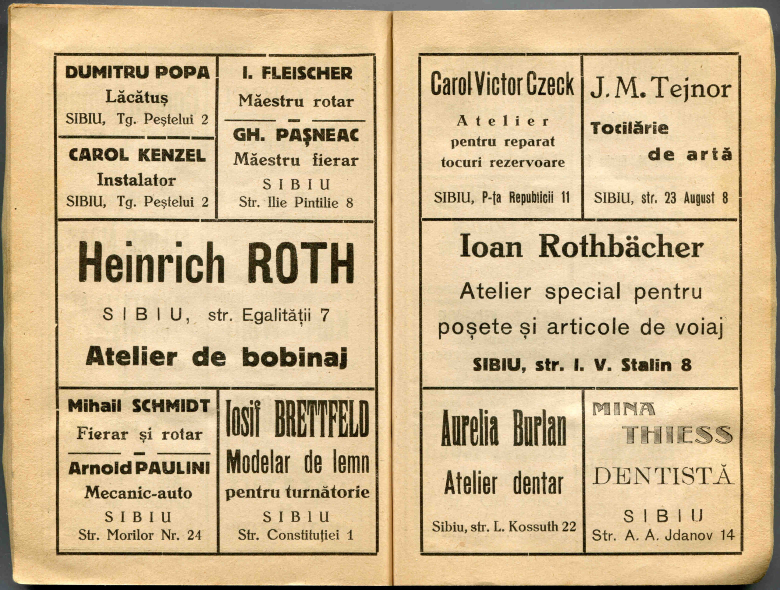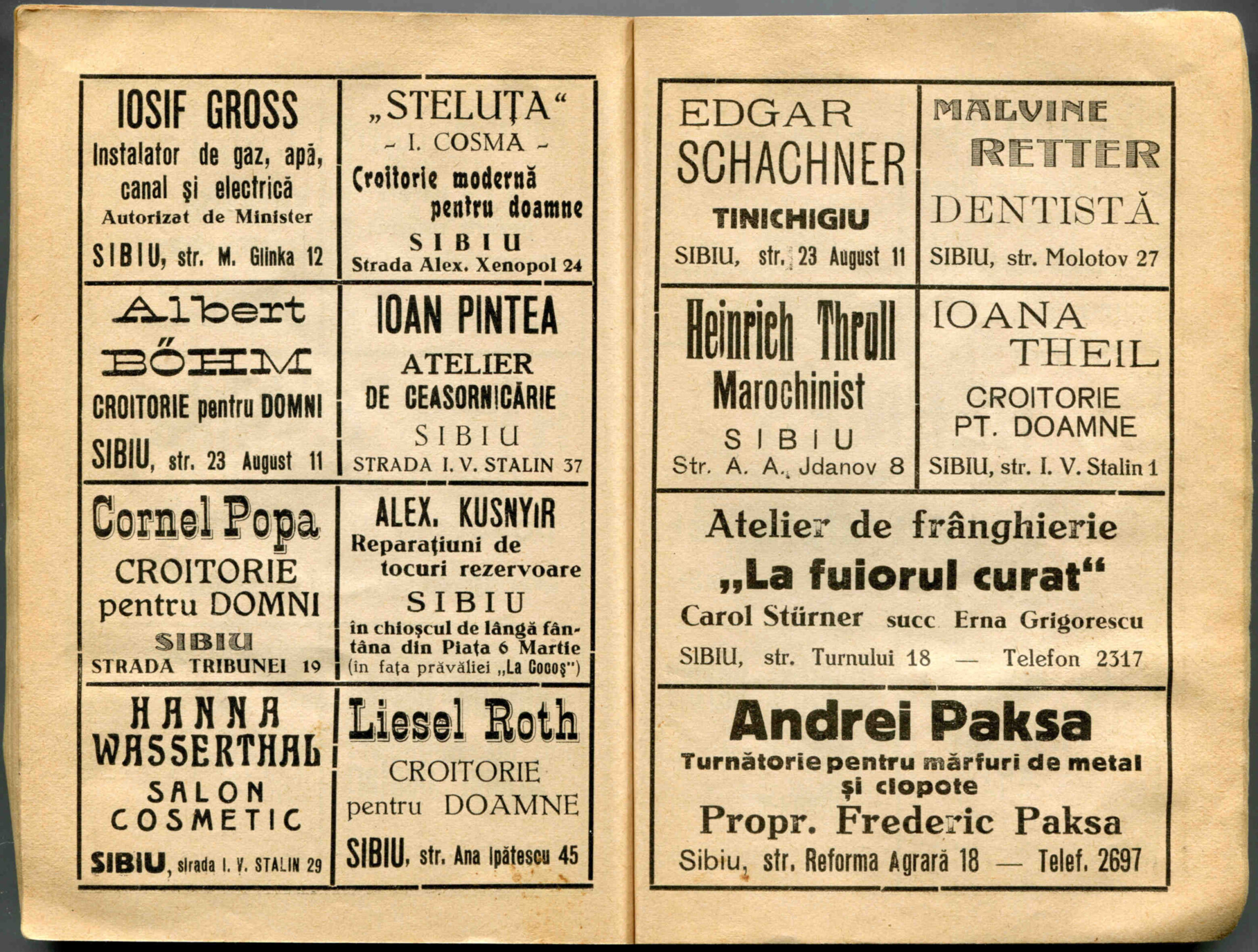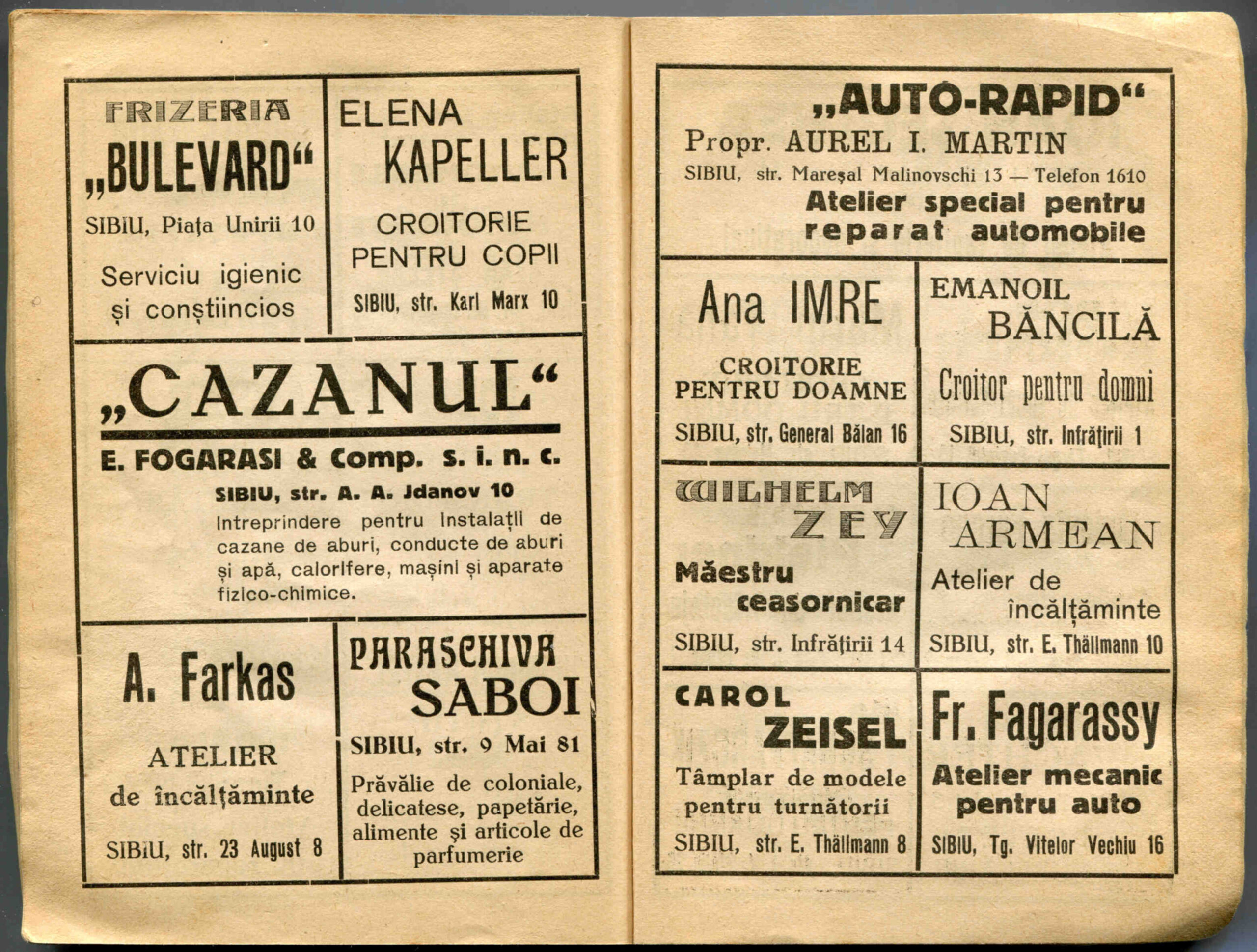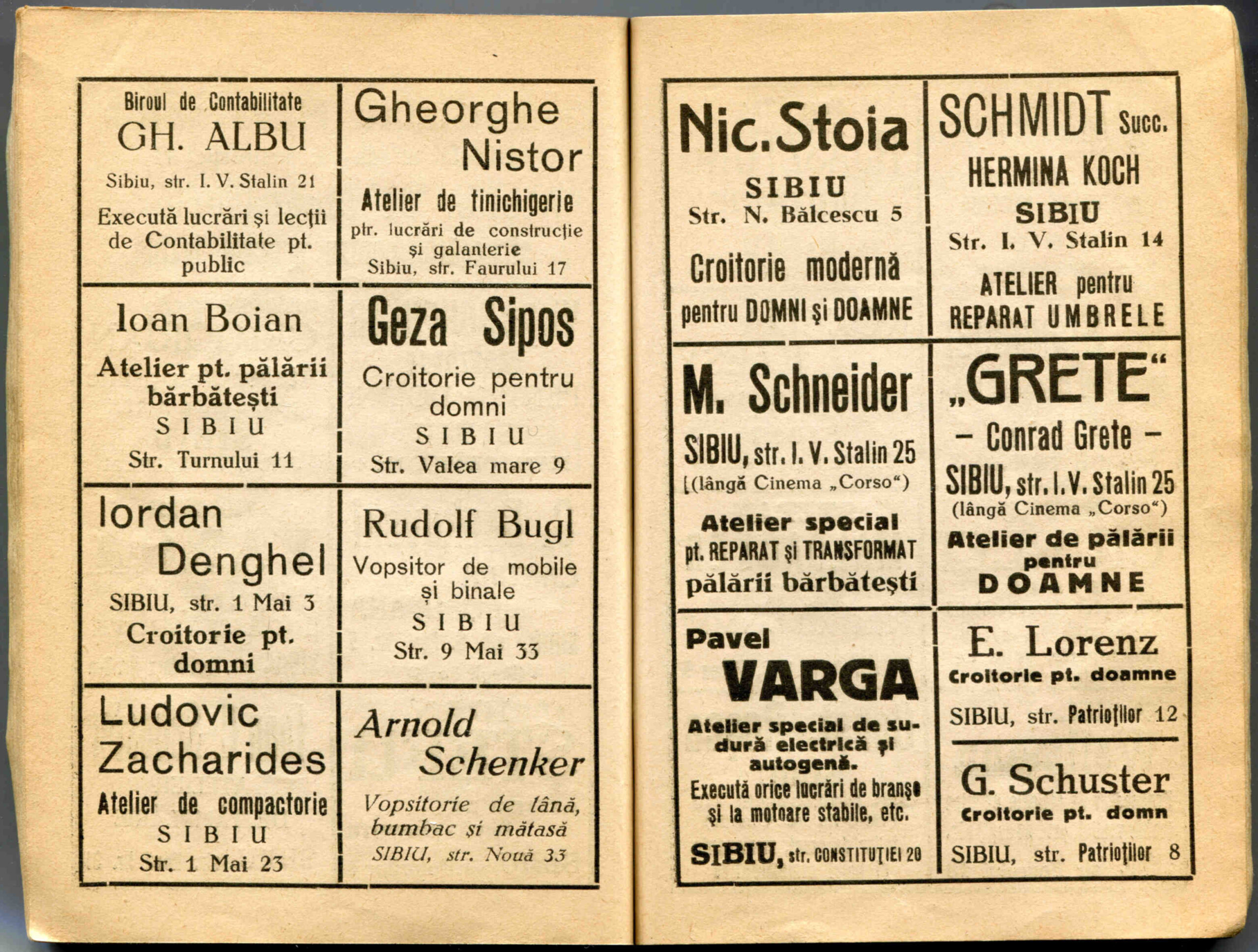Stânga: Reclamă comercială din cartea de adrese din 1898, la magazinul societății comerciale pe acțiuni „Concordia” care funcționa la parterul clădirii băncii Albina, strada Fleischergasse / Măcelarilor nr. 20, ( azi Mitropoliei 16 ).