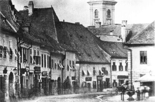 „Das Stühlerische Haus in Hermannstadt vor seiner Abtragung 1897” // „Casa Stühler din Sibiu înainte de a fi demolată în 1897”