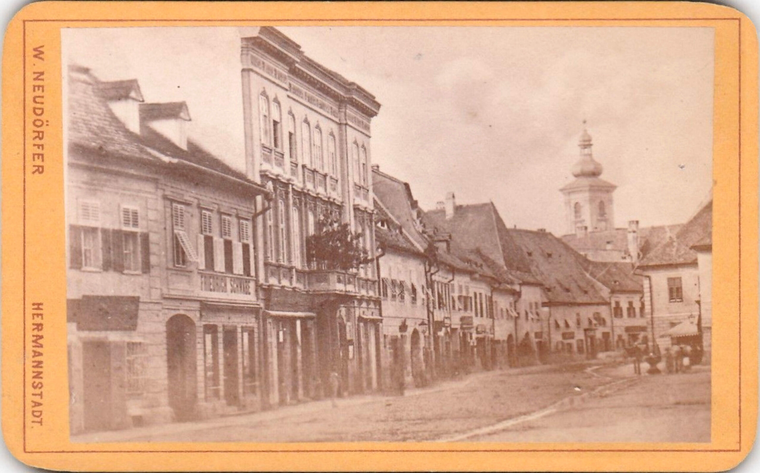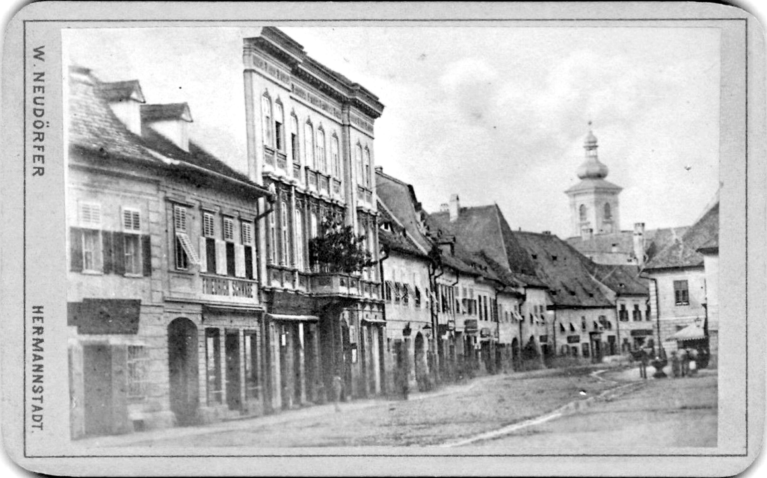 Strada Turnului din Sibiu, cu Biserica Evanghelică în fundal, fotografiată în jurul anului 1896 de la intersecția cu strada Valea Mare. Fotografia originală, 159×118 mm, este lipită pe un suport de carton, 178×128 mm.