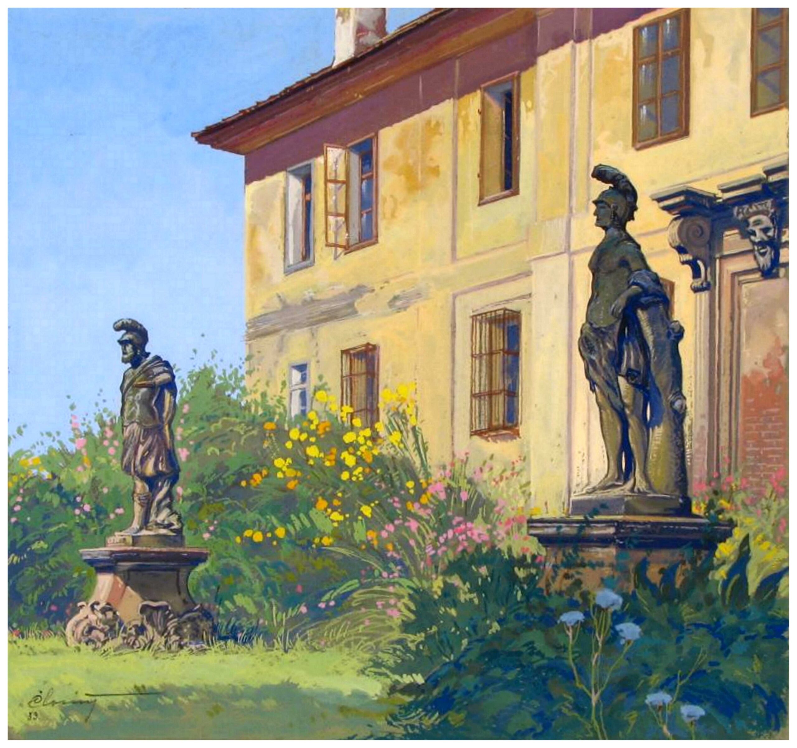 În pictura realizată de Karl Eduard Closius ( 1893-1959 ) în anul 1933 se vede fațada sudică a clădirii de pe strada Reconstrucției nr.35, ( germană, Brückengasse ), și o parte din grădina în care se aflau două statui deosebit de frumoase. Cele două statui reprezintă pe Ares / Marte și Pallas Athena / Minerva, ( cf. Nicolae Sabău, Metamorfoze ale barocului transilvan. Sculptura. vol. I. Ed. Dacia Cluj-Napoca 2002 ). Statuile se aflau inițial în curtea unui clădiri situată pe strada Mitropoliei, ( germană, Fleischergasse ). Cu ocazia demolării clădirii în 1913, statuile au fost demontate și amplasate în grădină dl. dr. Minerva Balint, str. Reconstrucției nr.35.