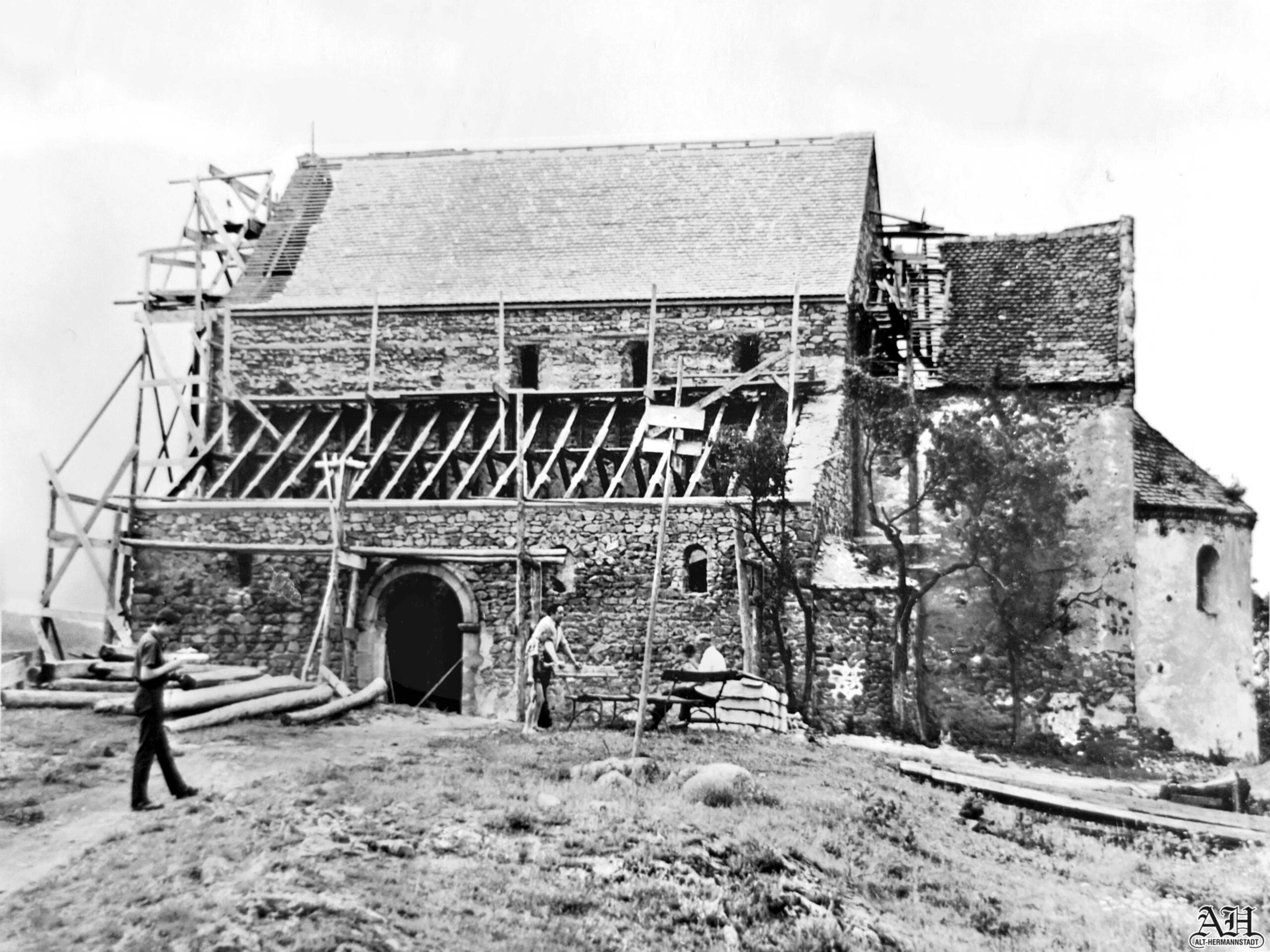 Biserica fortificată de la Cisnădioara fotografiată în perioada lucrărilor de renovare efectuate 1966. Persoana care stă lângă bancă este maistrul electrician Johann (Hans) Fetter. Domnul Fetter s-a ocupat și de intreținerea/ reparația instalației electrice a Bisericii Evanghelice din Sibiu. Fotografie din arhiva familială.