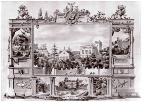 Pictura relizată de A. Sporner în 1889 arată grădină și clădirea de pe Șoldiș după supraetajarea corpului nord-estic cu terasă/ belvedere și ridicarea turnului prevăzut cu creneluri, construit după modelul castelului Miramare, în perioadă 1883-1889 (fotocredit Georg Coulin).