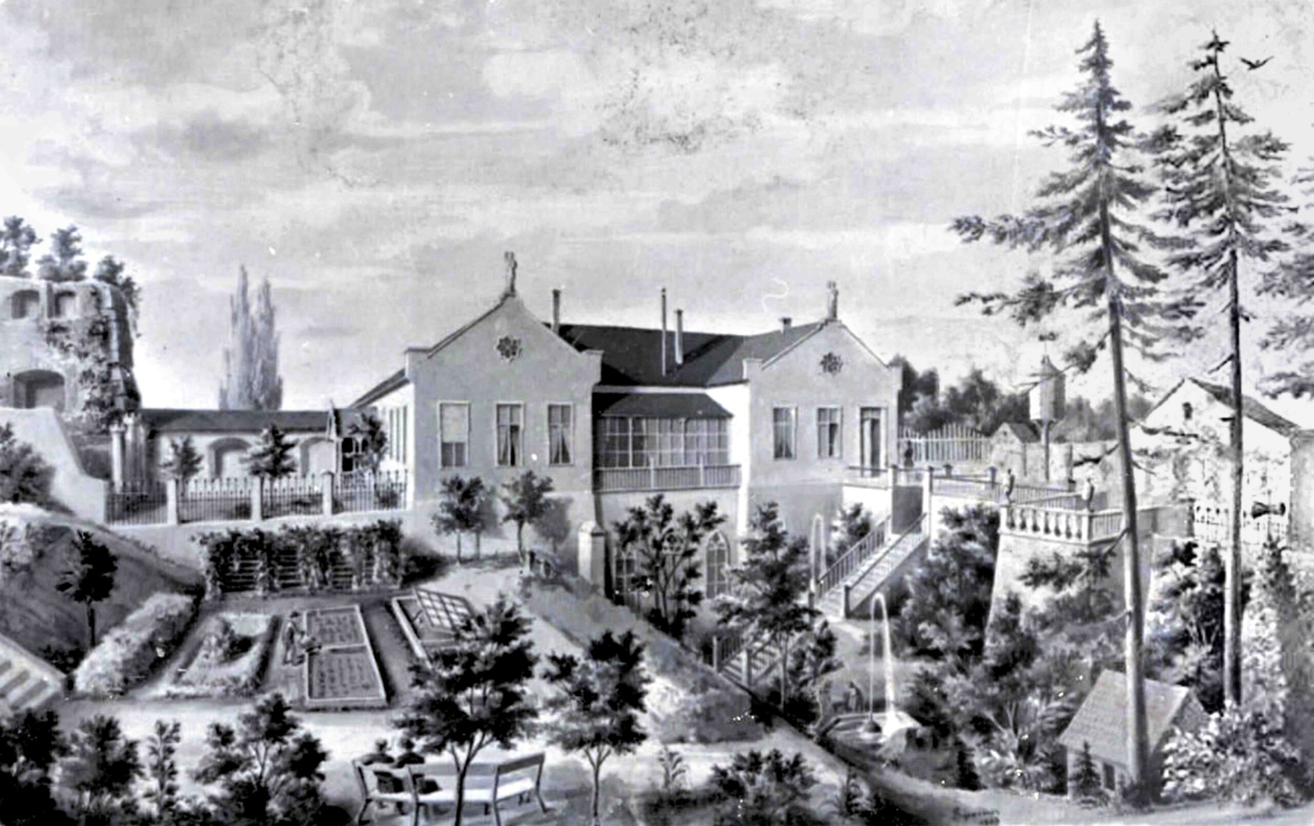 Pictura relizată de A. Sporner în 1889 arată grădină și clădirea de pe Șoldiș după supraetajarea corpului nord-estic cu terasă/ belvedere și ridicarea turnului prevăzut cu creneluri, construit după modelul castelului Miramare, în perioadă 1883-1889 (fotocredit Georg Coulin).