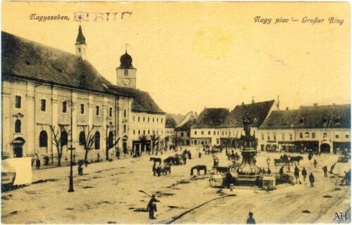 Piața Mare din Sibiu forografiată în perioada antebelică. În partea dreaptă se vede Statuia Sf. Nepomuk și în partea stângă Biserica Catolică și în fundal Turnul Sfatului. Fotografia a fost făcută după ce a fost înlăturată fântăna medievală la sfârșitul secolul al XIX-lea dar înainte de ridicarea noii fântăni „Falkenhayn” la sfârșitul primului deceniu al al secolului al XX-lea. Carte poștală editată la Budapesta în 1918 / colecția personală.