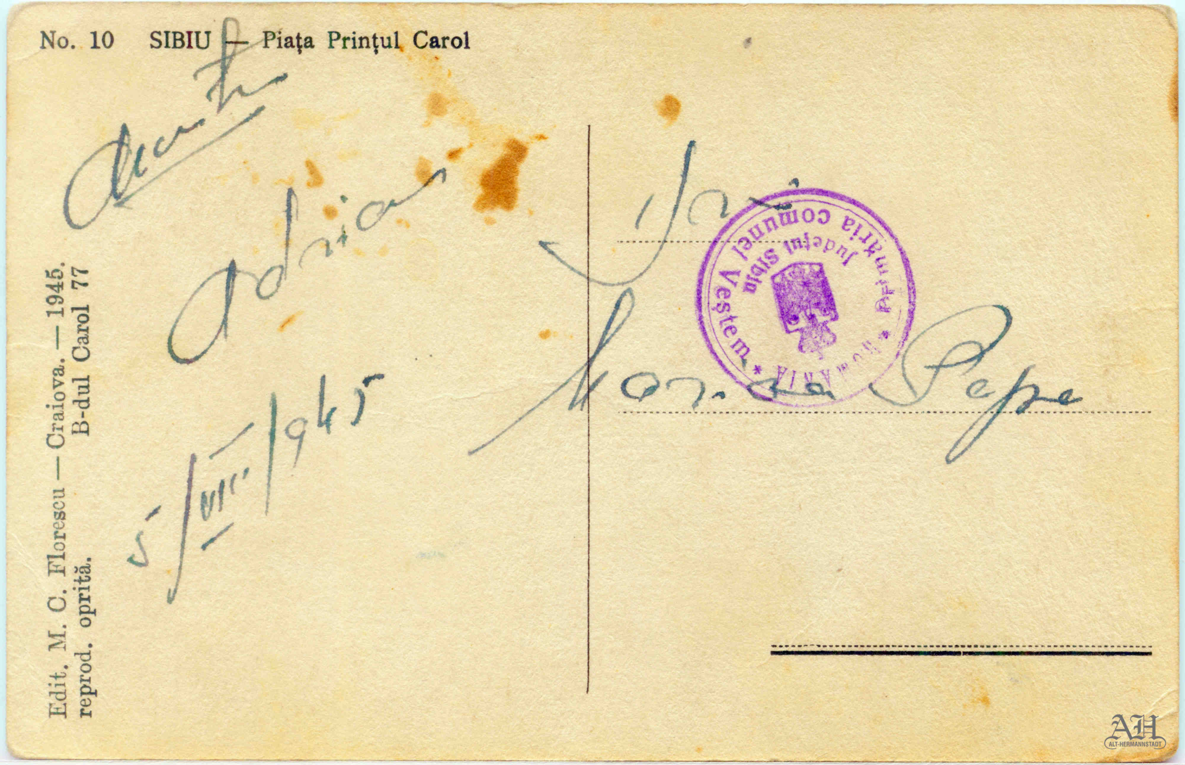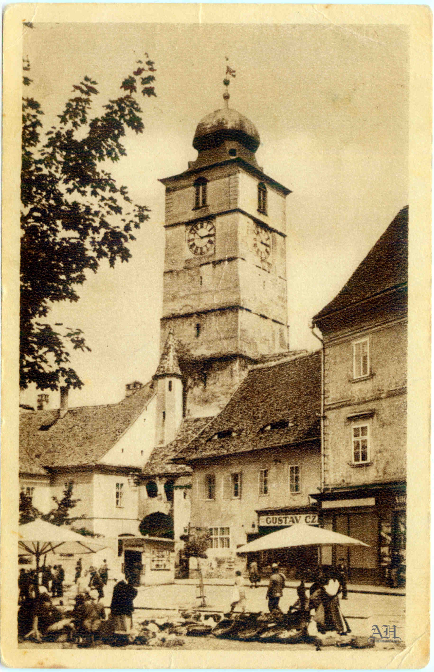 Turnul Sfatului văzut dinspre Piața Mică / Piața Prințul Carol – Carte poștală tipărită la Editura M. C. Florescu – Craiova – 1945. Fotografia a fost realizată la sfârșitul anilor 1930 (probabil de fotograful sibian Emil Fischer).