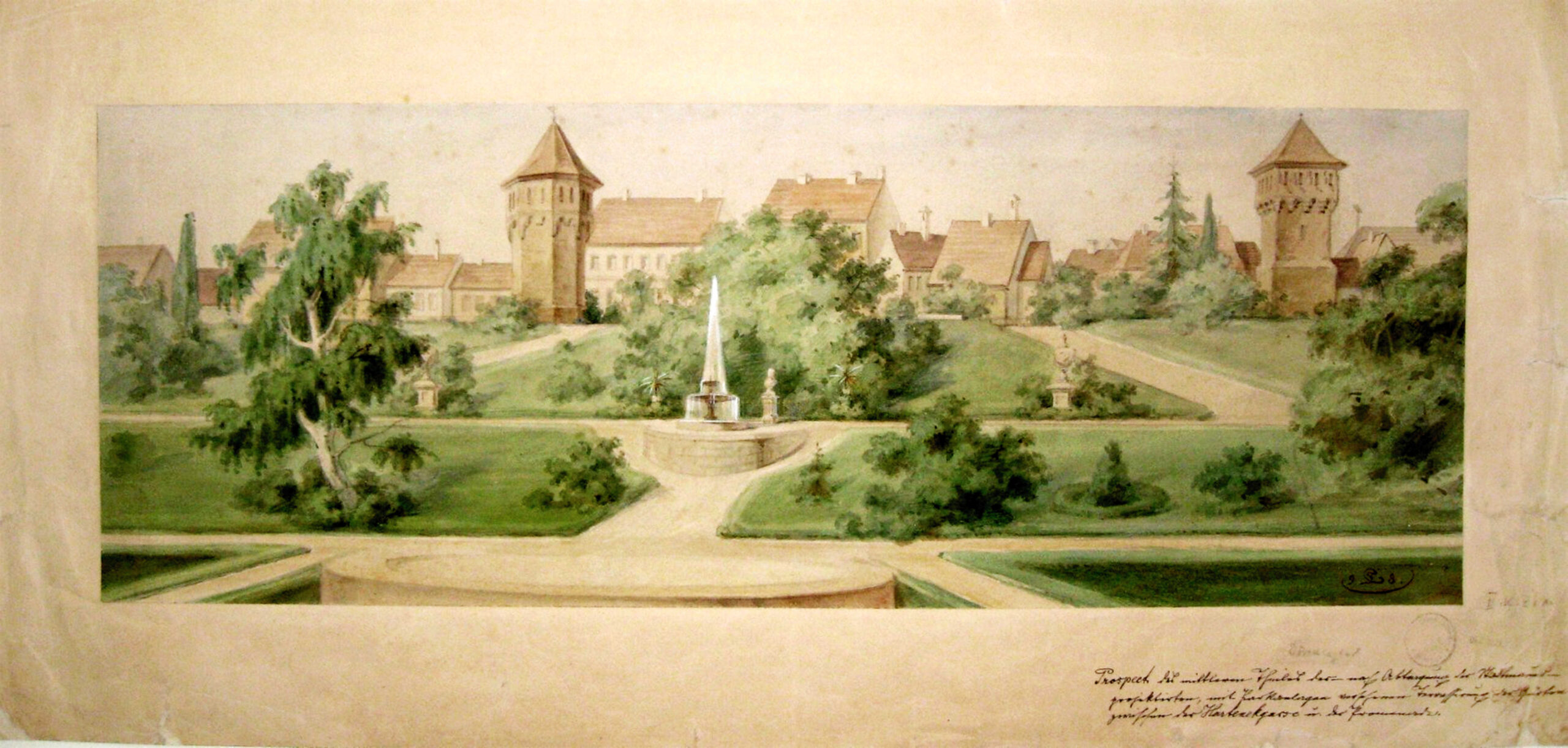 „Prospect des mittleren Theiles der nach Abtragung der Stadtmauern projektierten, mit Parkanlagen versehenen Terrassierung der Gärten zwischen der Harteneckgasse und der Promenade“ ~ textul în limba germană din ilustrație.
