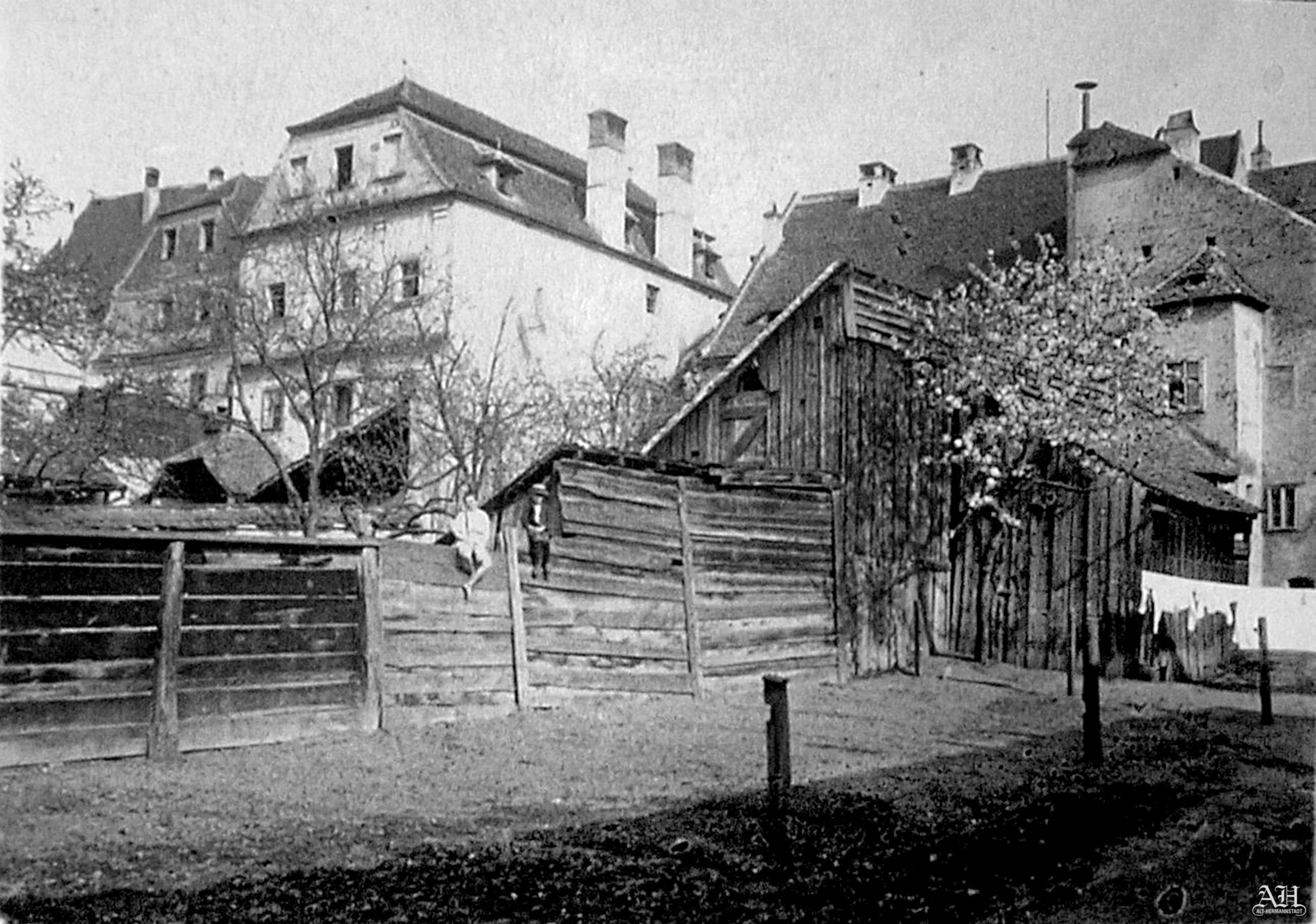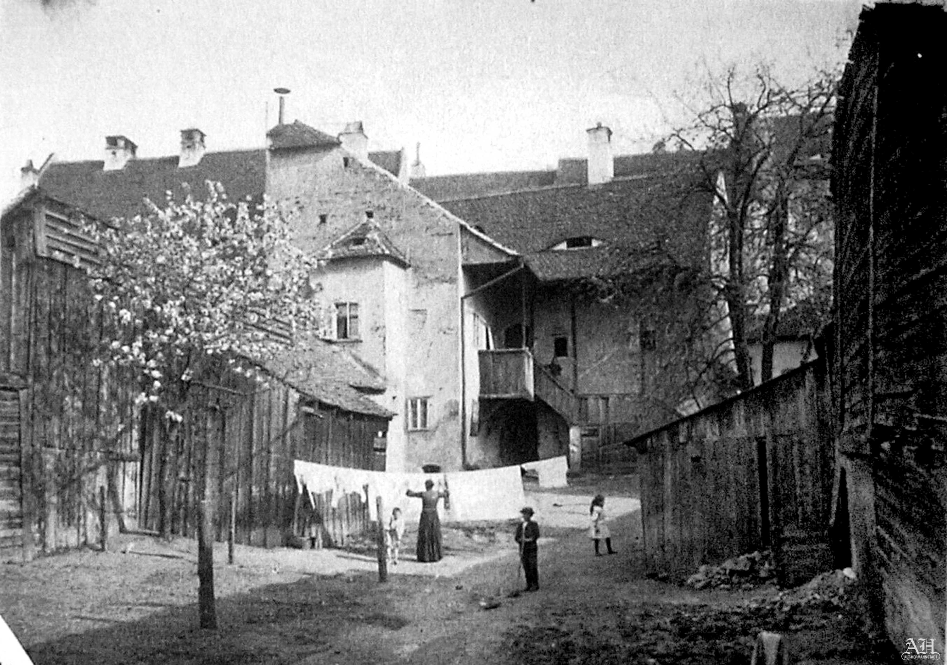 Următoarele două fotografii alb-negru au fost realizate la sfârșitul anilor 1920 în Sibiu. Fotograful mie necunoscut a capturat pe negativele aparatului său de fotografiat o felie pitorească din viața urbană, care s-a desfășurată în fața ochilor săi într-o curte situată la poalele platoului pe care se întinde Orașul de Sus. Cele două grupuri de persoane, format din șapte protagoniști, interacționează într-un mod interesant, plăcut. Femeia care întinde rufele pe sârmă la uscat ține brațele ridicate ca o dirijoare.