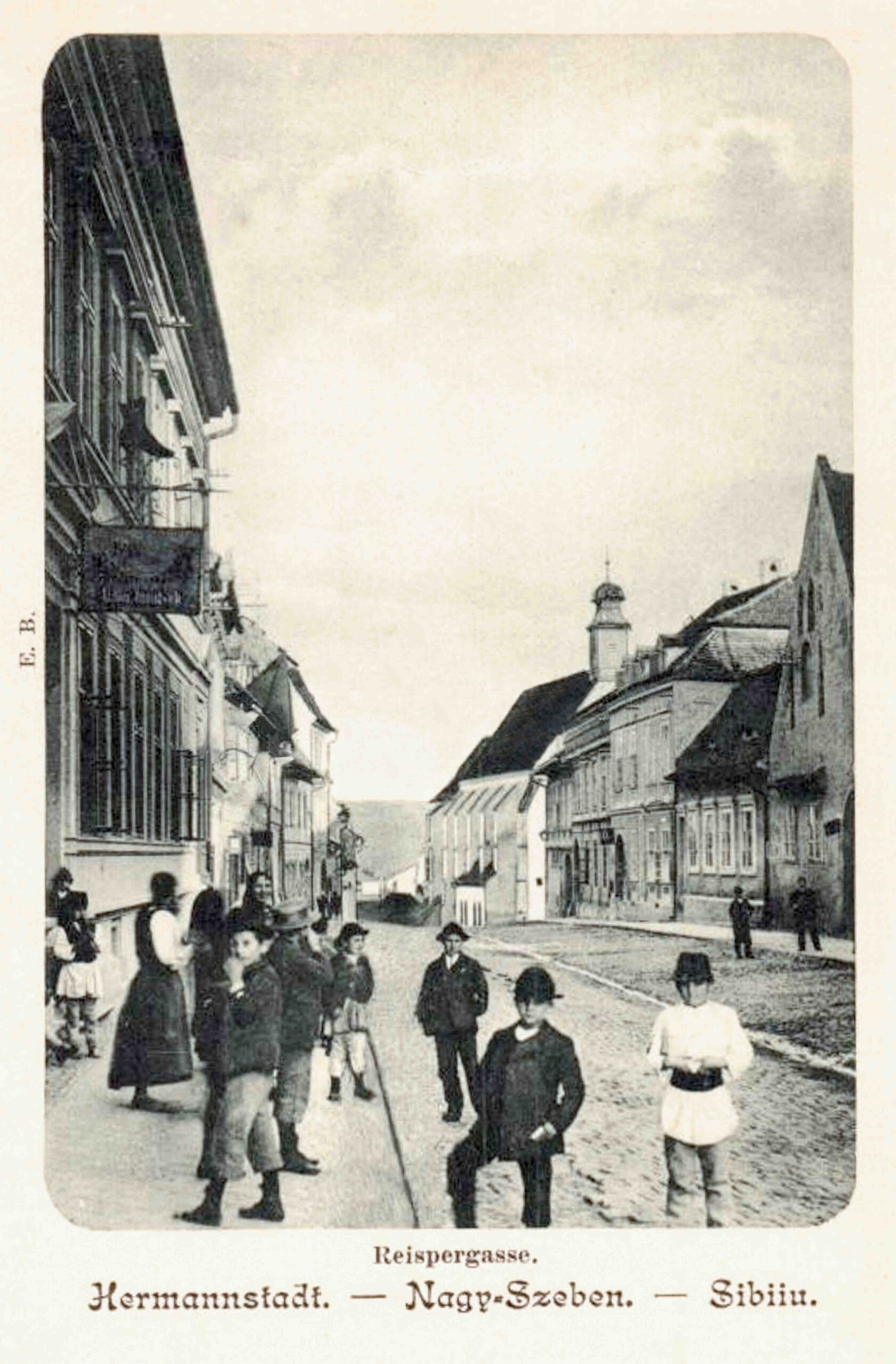 Carte poștală de tip LEVELEZÖ-LAP, tipărită la sfârșitul ultimului deceniu al secolului al XIX-lea, circulată în 1902. În partea de jos a ilustrației se află textul: „Reispergasse | Hermannstadt – Nagy-Szeben – Sibiiu”. În fundal se vede biserica mănăstirii Ursulinelor ridicată în 1474 de călugării dominicani.