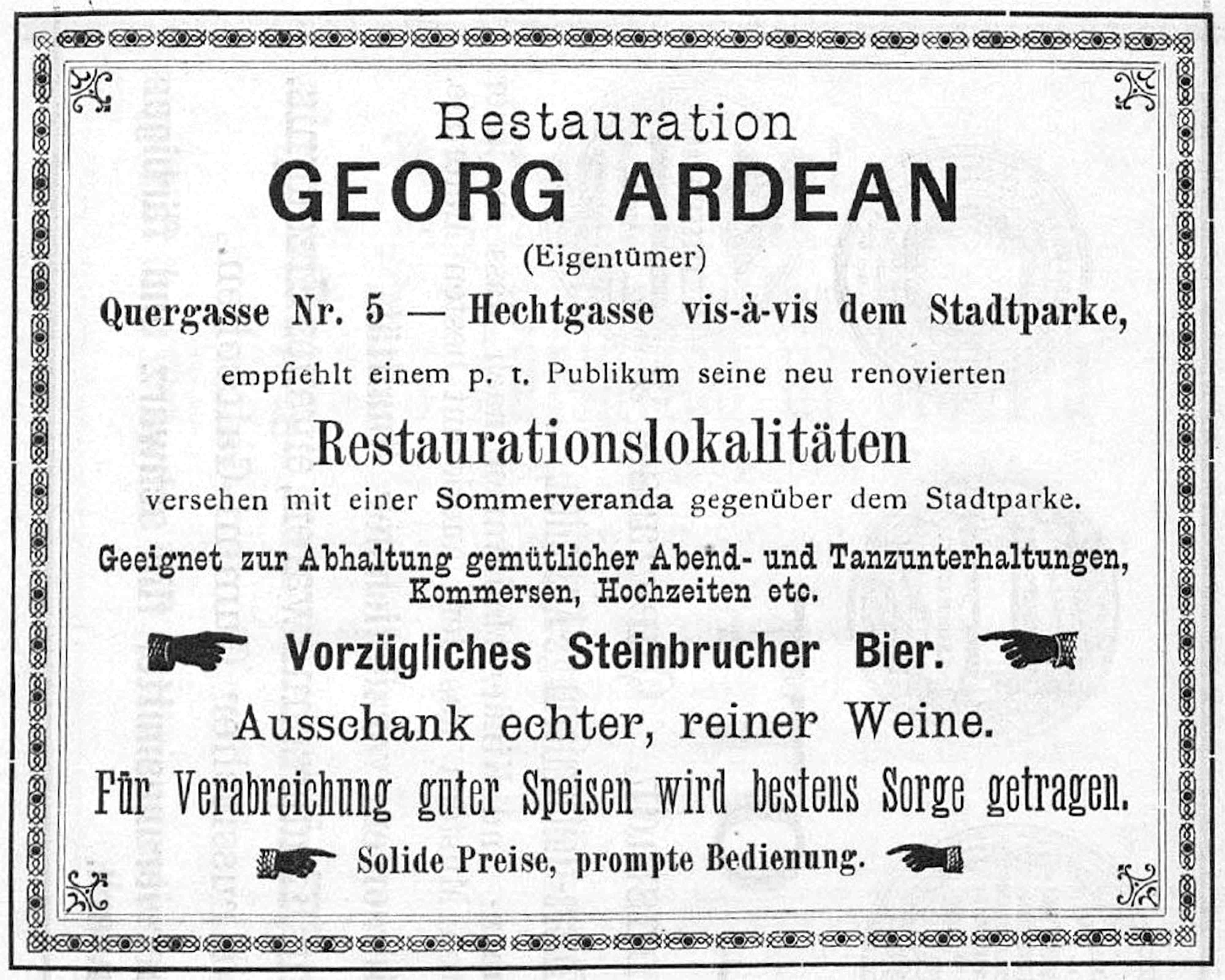 În cartea de adrese din 1895 este menționat restaurantul lui George Ardean ( Georg Ardean ) deschis în spațiul nou renovat situat „vis-à-vis de parcul Stadtpark” – vezi relama alăturată din 1895!