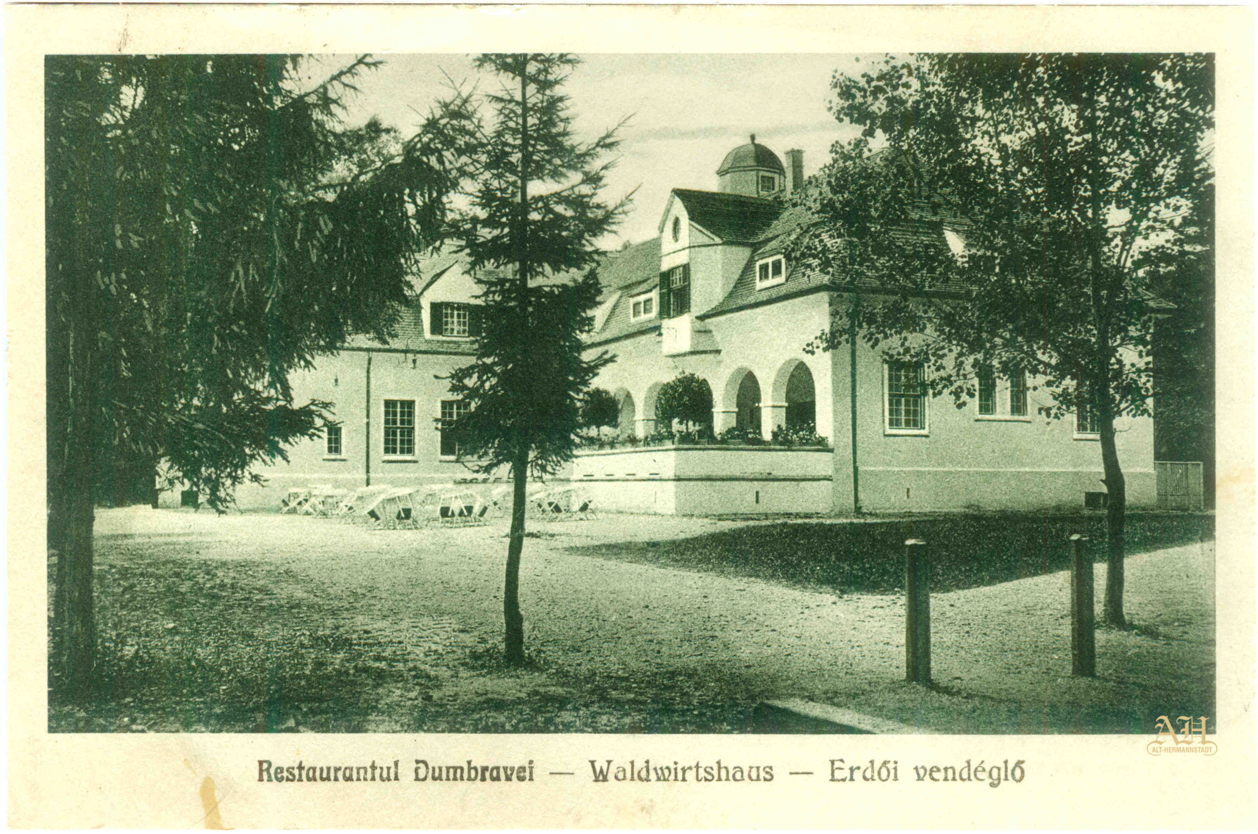 Noul restaurant din pădurea Dumbrava Sibiului. Carte Poștală tip LEVELEZÖ-LAP din perioada interbelică (circulată 1930) realizată la tipografia Krafft & Drotleff A.G. / Sibiu – Hermannstadt. Clădirea noului han din Pădurea Dumbrava (Sibiului) // Junger Wald a fost construită la începutul celui de al doilea deceniu al secolului al XX-lea, după planurile arhitectului sibian Ludwig Orendt (1876-1930).