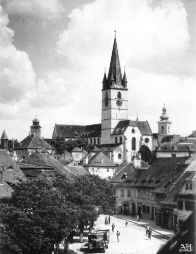 „Saggasse und Evangelische Kirche in Hermannstadt” // „Strada Turnului și Biserica Evanghelică din Sibiu“ ~ um 1960