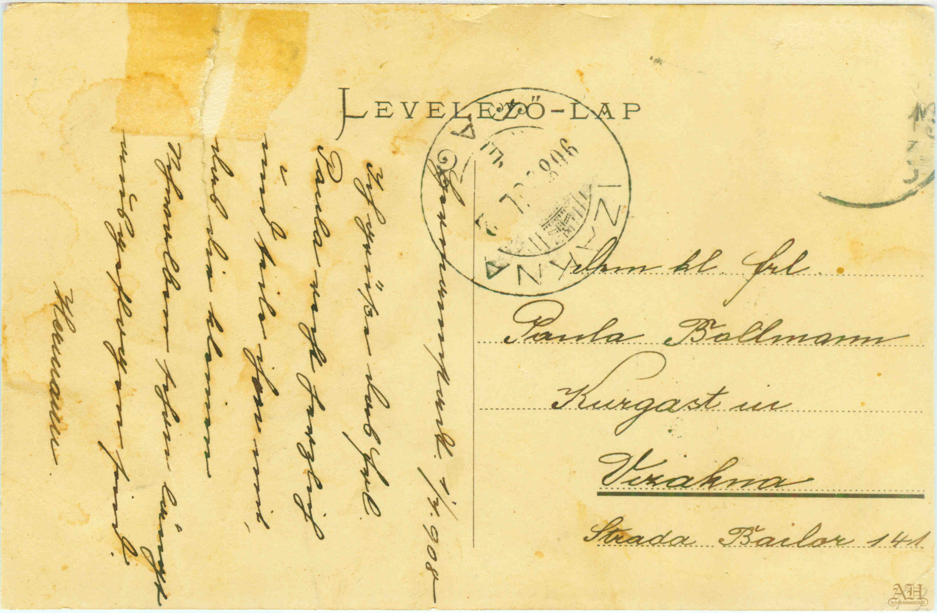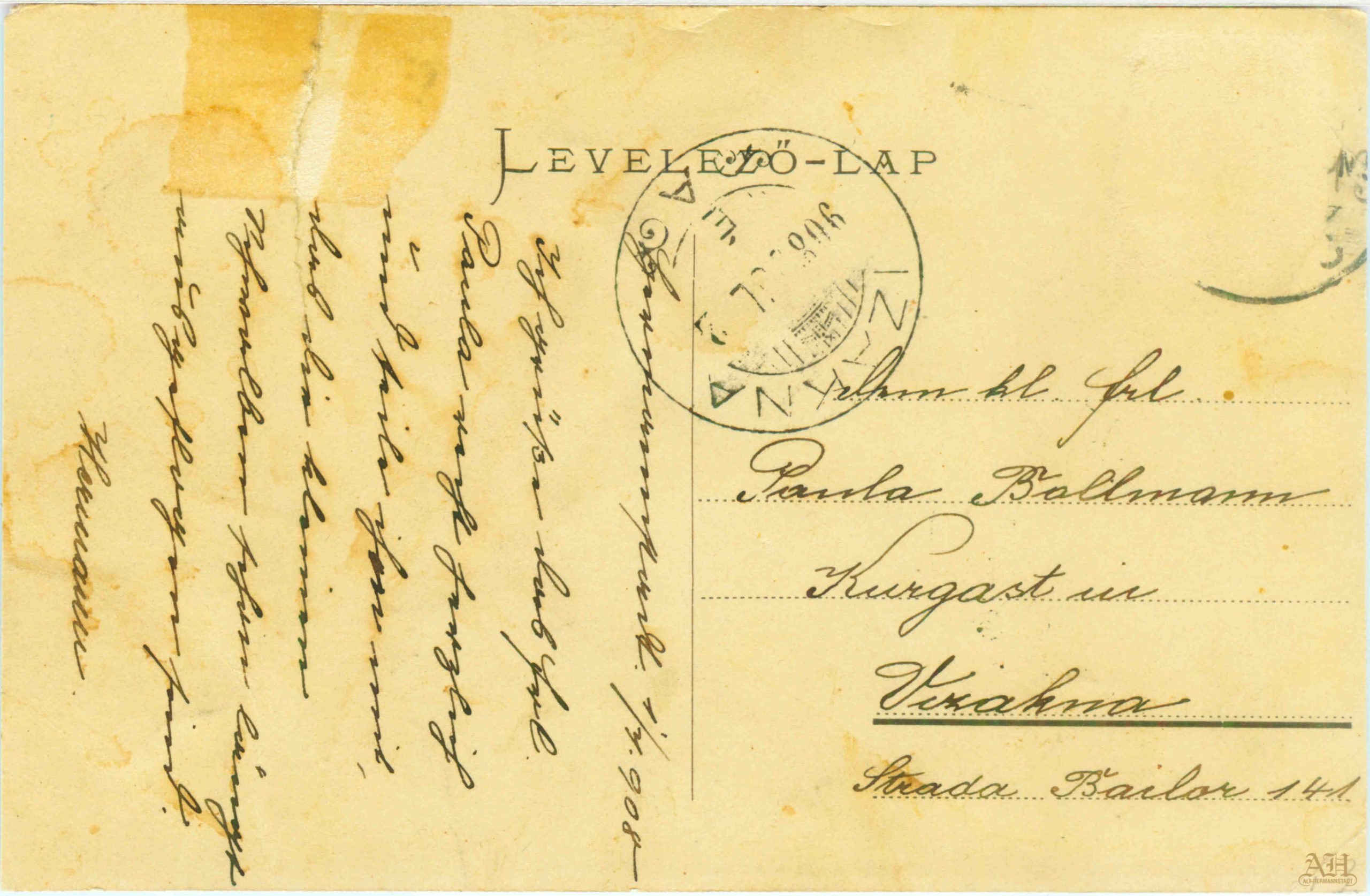 Cartea poștală ilustrată tip LEVELEZÖ LAP a circulat în luna iulie 1908 între Sibiu și Ocna Sibiului. A fost adresată domișoarei Paula Ballmann aflată la stațiunea balneară Ocna Sibiului // Salzburg // Vizakna.