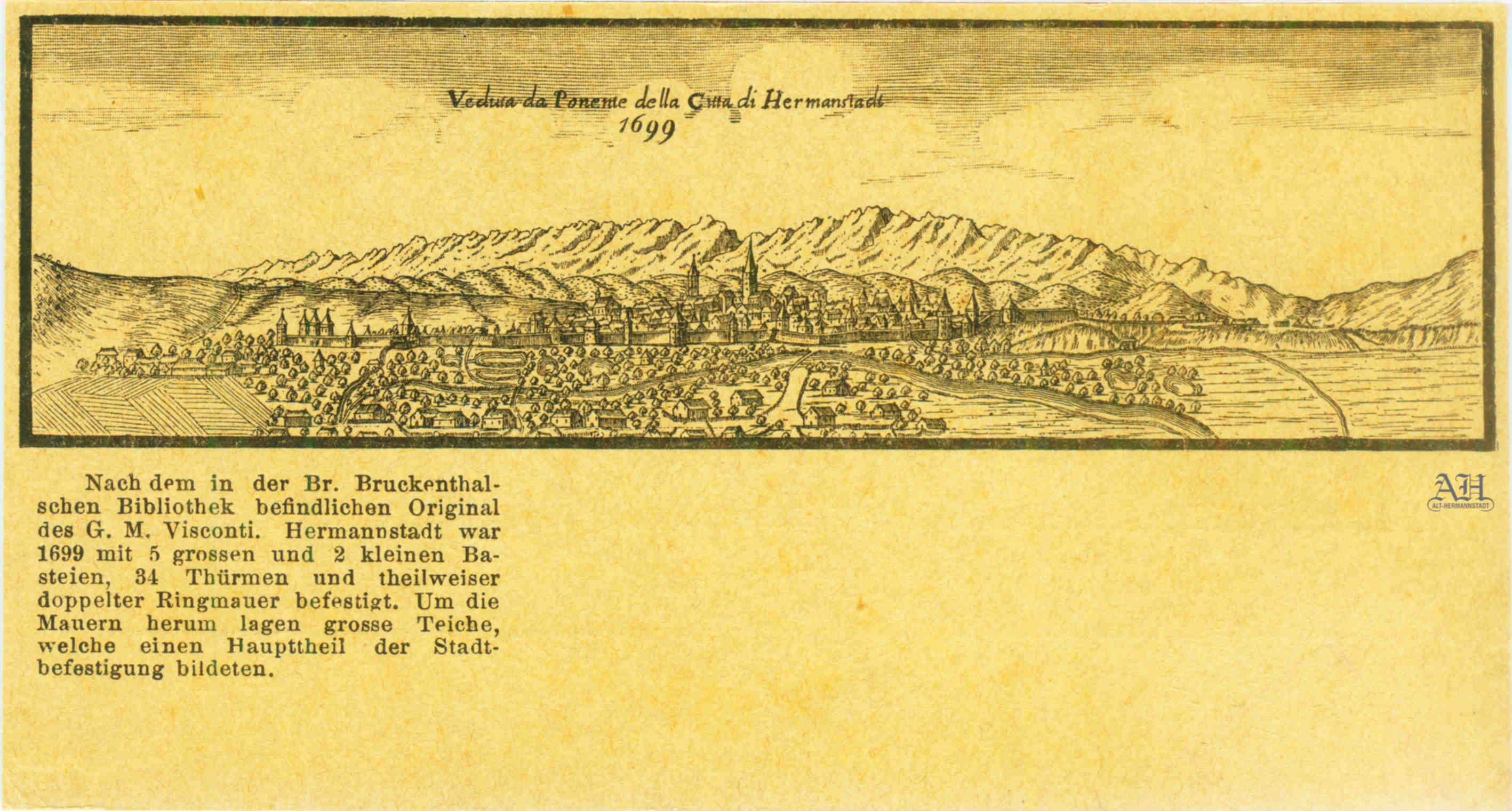 Veduta impreună cu planul orașului Sibiu apar în renumita „Mappa della, Transilvania“ (e Provintie contique nella qualesivedano li Consini dell’ Ongaria eli Campam fatti dall; Arpate Cesaree in quelte ultime guere) a lui Giovanni Morando Visconti. Carte poștală tip „LEVELEZÖ-LAP“ (detaliu)