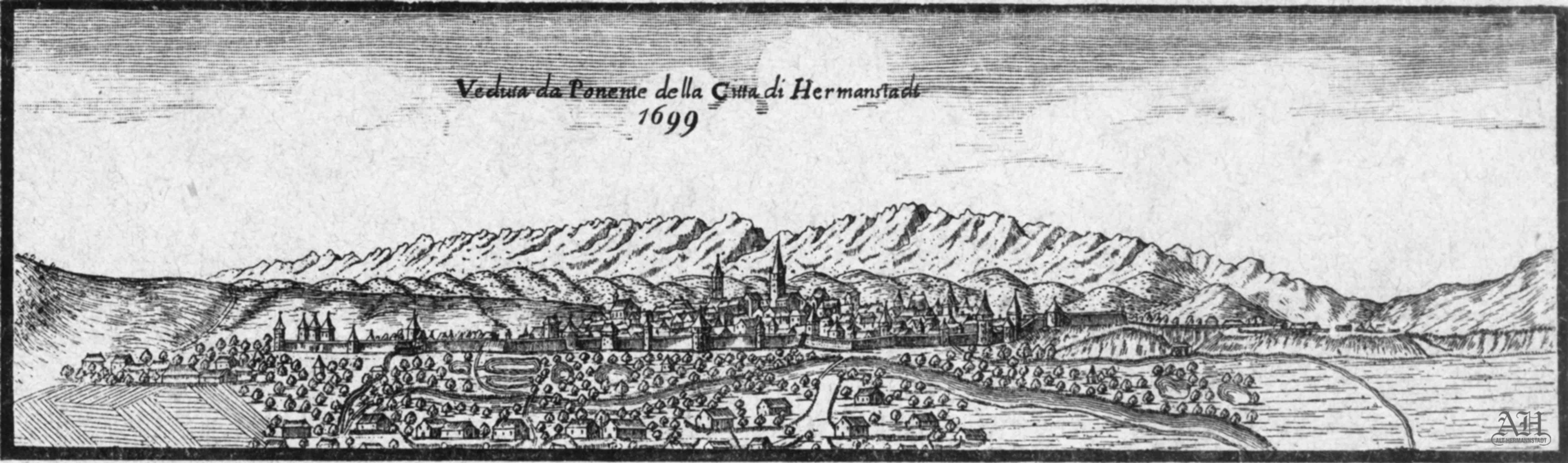 Veduta da Ponente della Citta di Hermanstadt – Gravură de Stephan Welzer / Sibiu 1699 // Veduta da Ponente della Citta di Hermanstadt – Kupferstich von Stephan Welzer / Hermannstadt 1699“