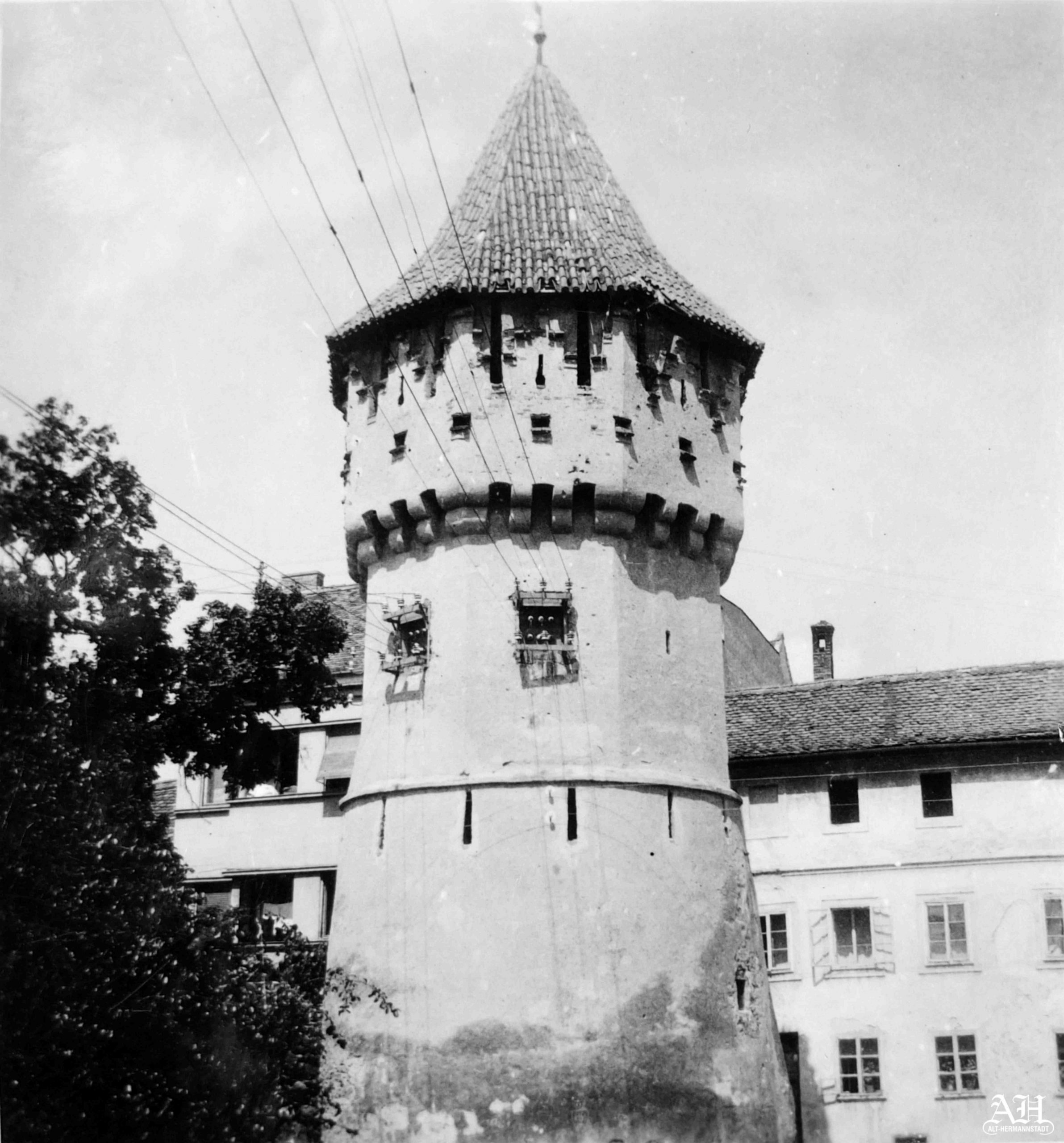 Turnul Dulgherilor de pe strada Cetății, fotografiat 1955. Vedere dinspre Promenada Superioară / Promenada Cetății (Zwingerpromenade). Fotografie din arhiva familială.